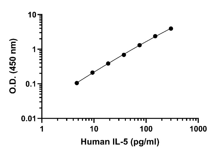 The dose response curve of the International Standard (90/586) parallels the OneStep standard curve. To convert sample values obtained with the kit to approximate NIBSC (90/586) units, use the following equation: NIBSC (90/586) approximate value (IU/mL) = 0.01 x OneStep Human IL-5 value (pg/mL).
