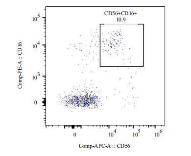 Human Blood samples were treated with APC Mouse anti-Human CD56 Antibody(4H6) after split red/hemolytic treatment (abs9101). Human FCR Blocking Reagent (abs9476) was used before staining. Signals were collected on BD LSR® flow cytometer, lymphocyte gating was performed by FSC/SSC, and relevant data analysis was completed by FlowJo®.