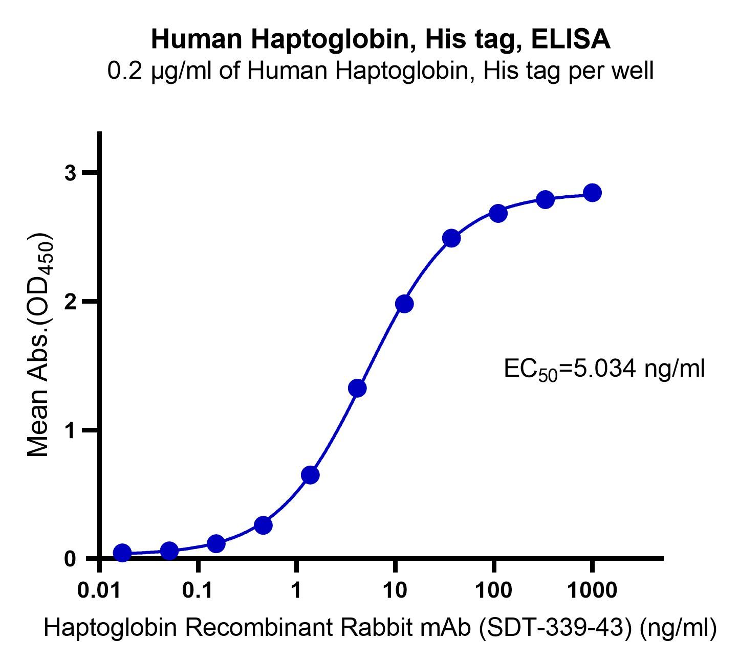 Immobilized Human Haptoglobin, His tag at 0.2 μg/mL (50 μL/well) can bind Haptoglobin Recombinant Rabbit mAb (SDT-339-43) (S0B3126) with EC50 of 4.725-5.364 ng/mL.