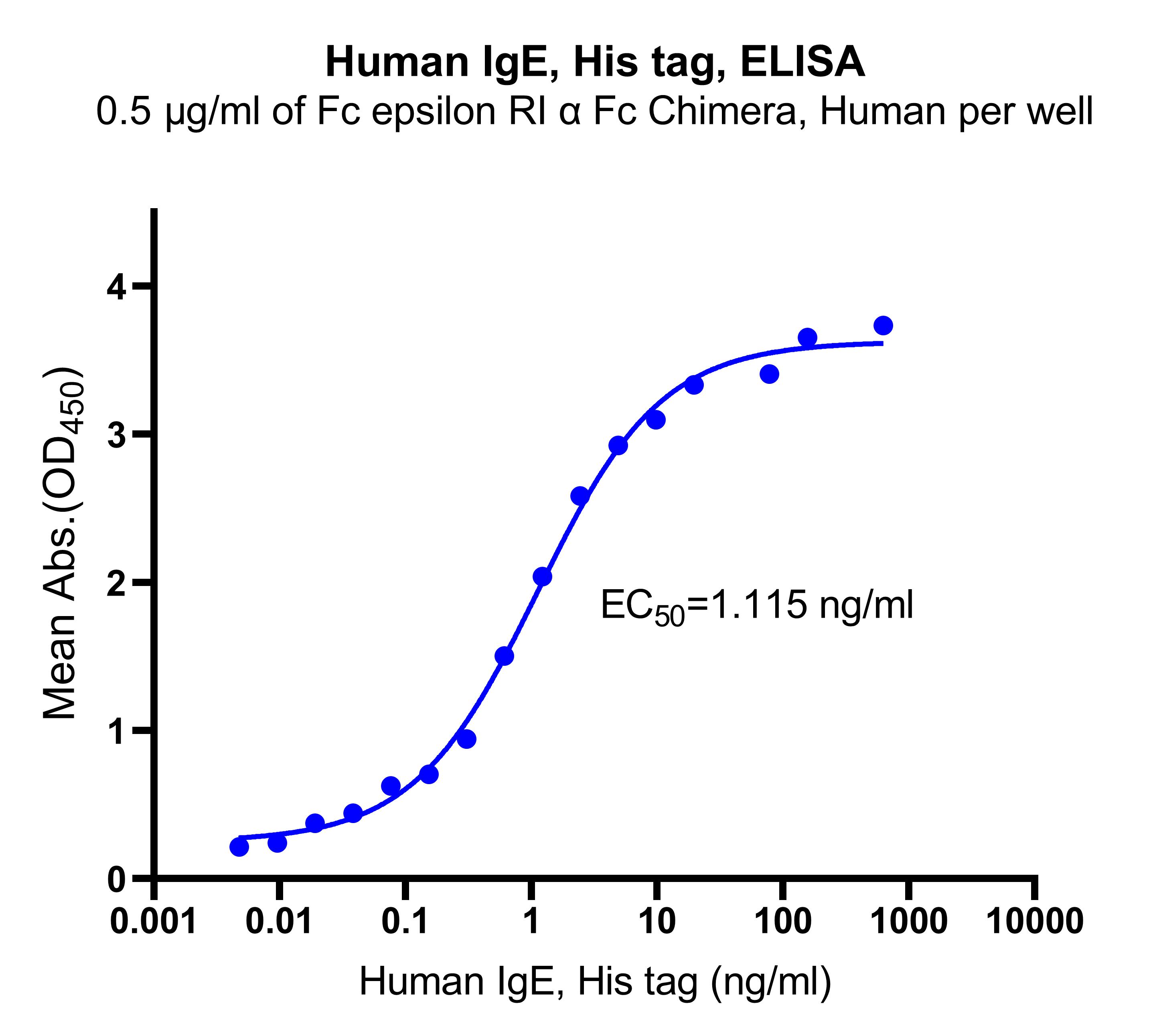 Immobilized Fc epsilon RI α Fc Chimera, Human (Cat. No. UA010147) at 0.5 μg/mL (100 μL/well) can bind Human IgE, His tag with EC50 of 0.885-1.402 ng/ml.
