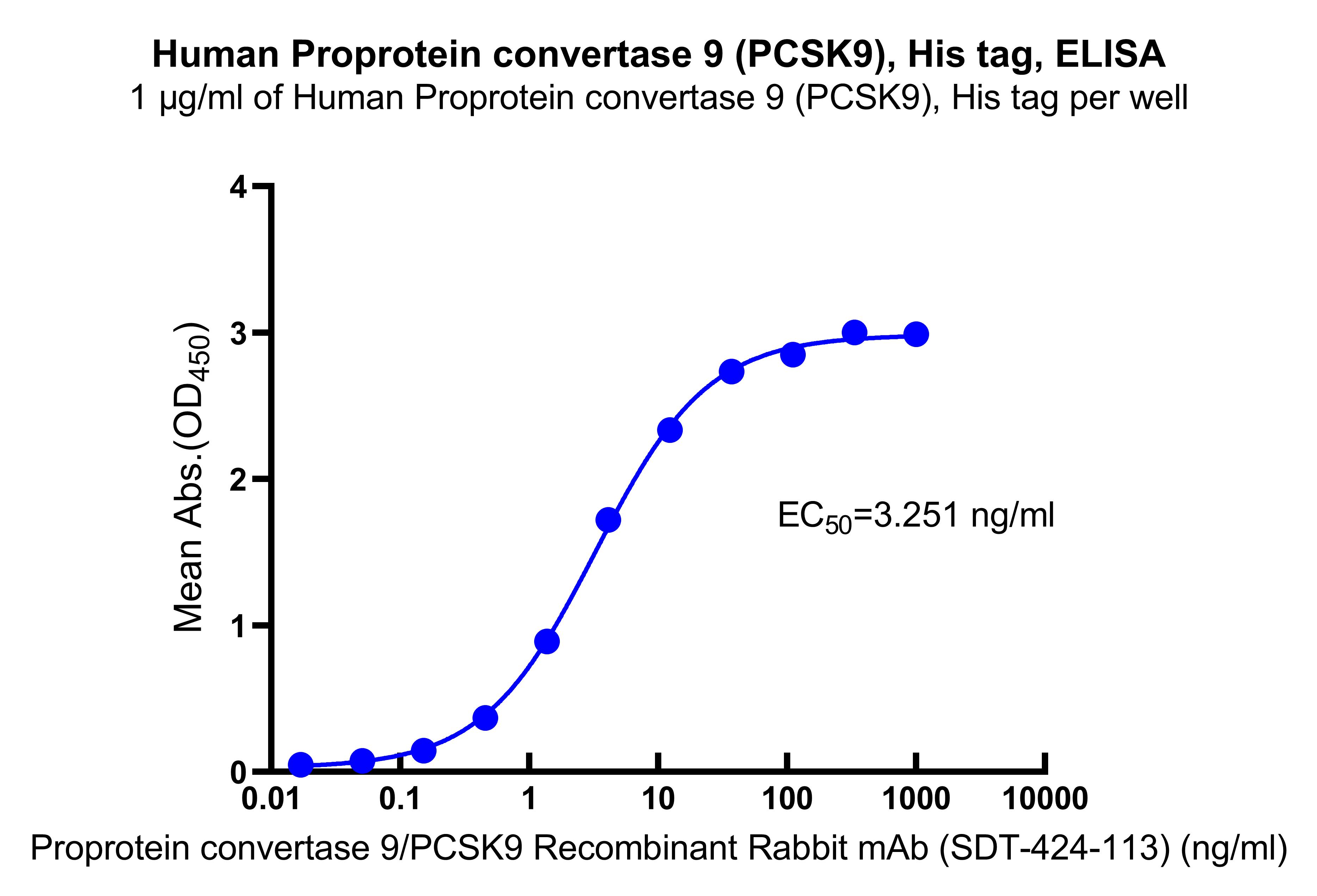 Immobilized Human Proprotein convertase 9 (PCSK9), His tag at 1 μg/mL (50 μL/well) can bind Proprotein convertase 9/PCSK9 Recombinant Rabbit mAb (SDT-424-113) (Cat. No. S0B0234) with EC50 of 2.938-3.598 ng/ ml.