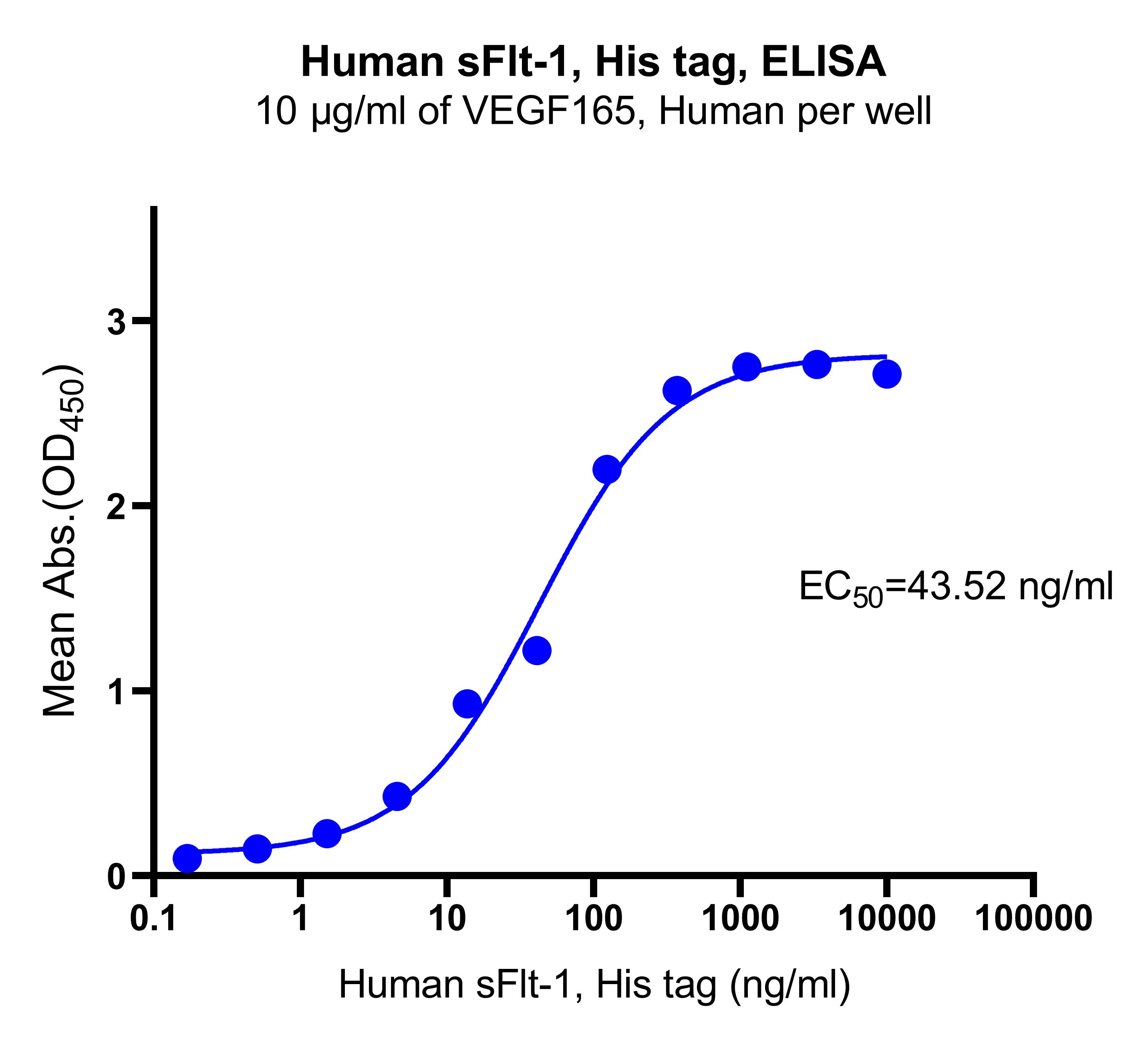 Immobilized VEGF165, Human (UA040019) at 10 μg/mL (50 μL/well) can bind Human sFlt-1, His tag with EC50 of 28.97-63.60 ng/ml.