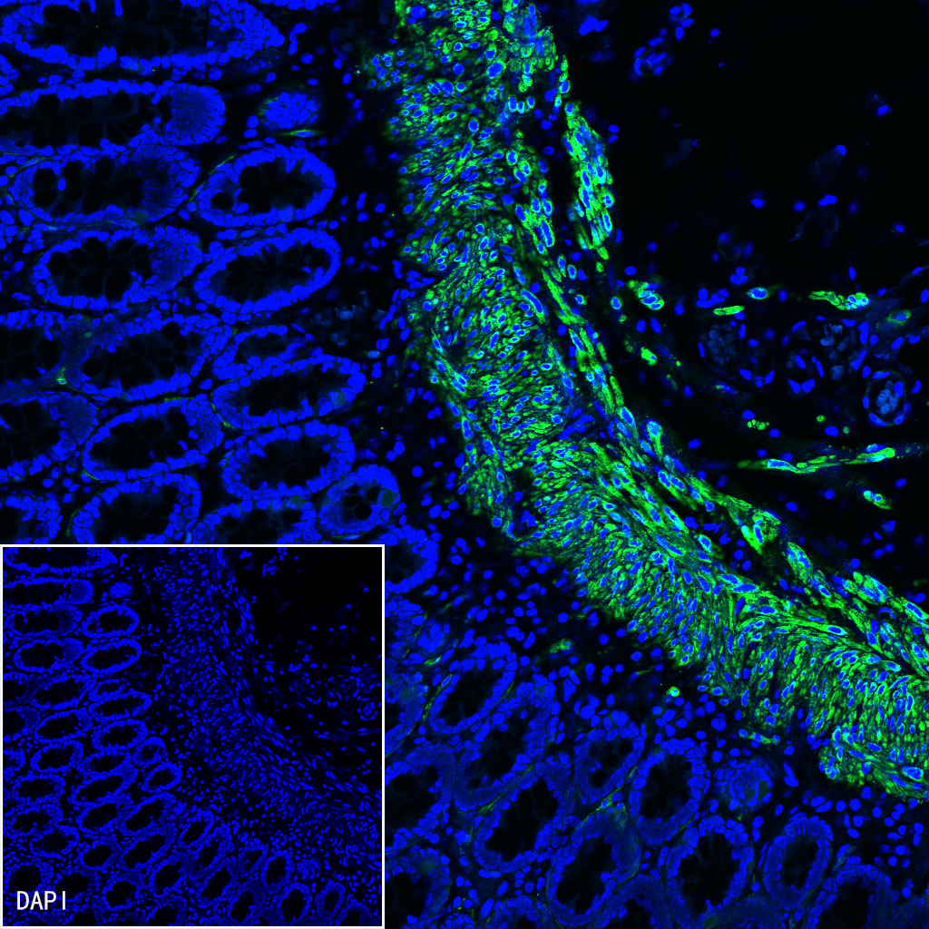 IF shows positive staining in paraffin-embedded human colon. Anti-Calponin-1 antibody was used at 1/1000 dilution (Green) and incubated overnight at 4°C. Goat polyclonal Antibody to Rabbit IgG - H&L (Alexa Fluor® 488) was used as secondary antibody at 1/1000 dilution. Counterstained with DAPI (Blue). Heat mediated antigen retrieval with EDTA buffer pH9.0 was performed before commencing with IF staining protocol.