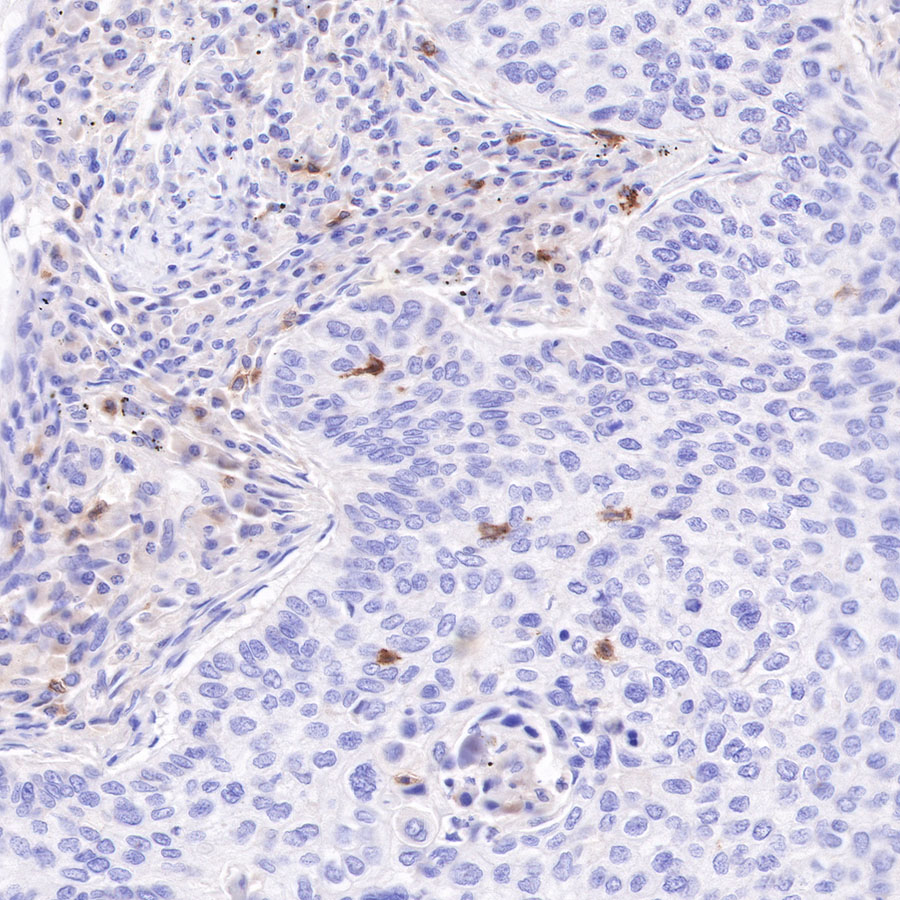 IHC shows positive staining in paraffin-embedded human lung squamous cell carcinoma. Anti-CD103 antibody was used at 1/100 dilution, followed by a HRP Polymer for Mouse & Rabbit IgG (ready to use). Counterstained with hematoxylin. Heat mediated antigen retrieval with Tris/EDTA buffer pH9.0 was performed before commencing with IHC staining protocol.