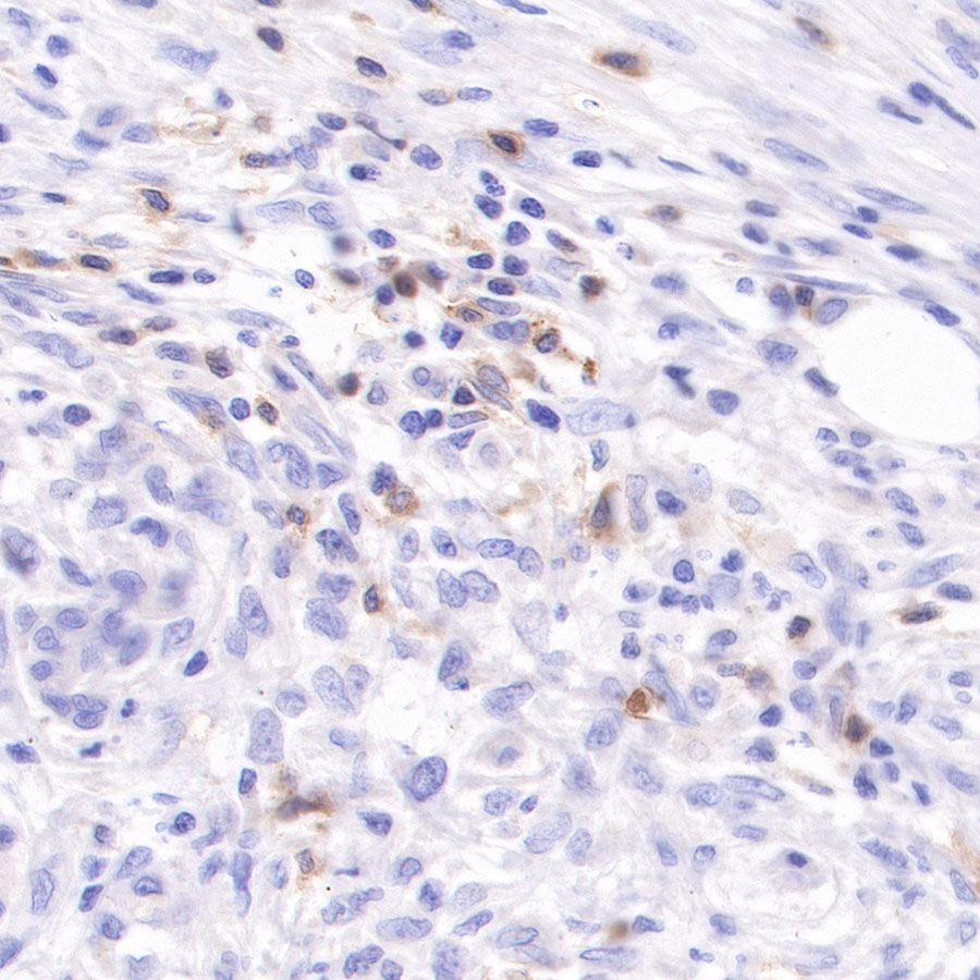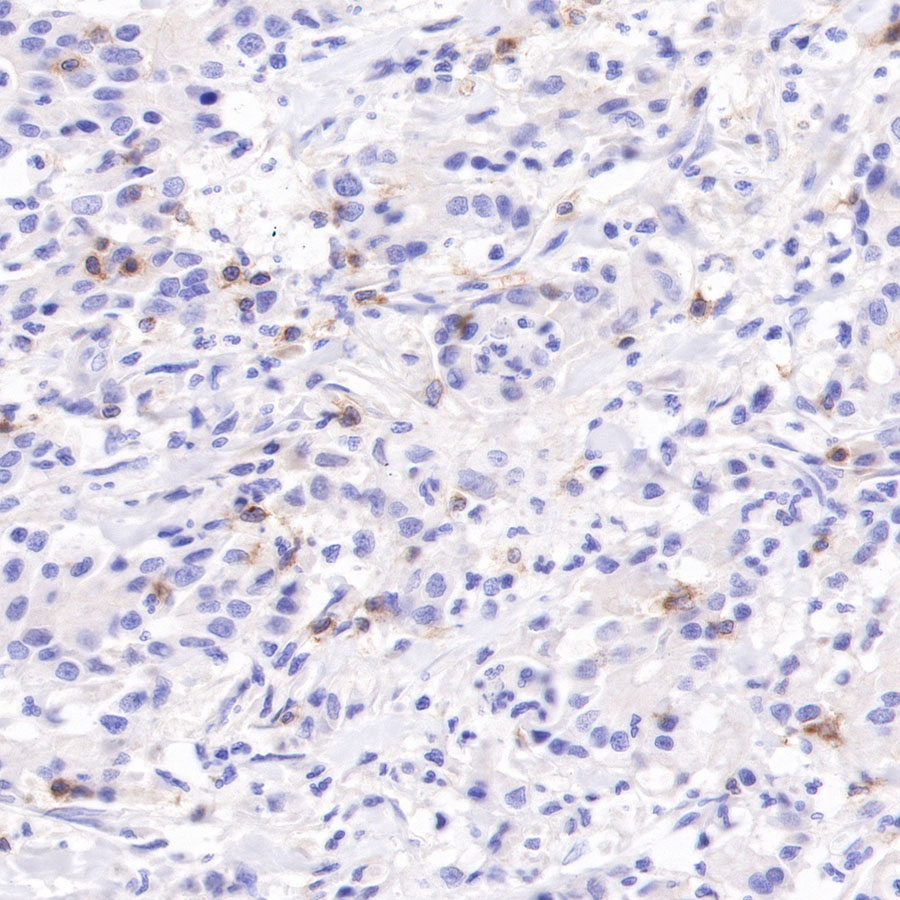 IHC shows positive staining in paraffin-embedded human gastric cancer. Anti-CD103 antibody was used at 1/100 dilution, followed by a HRP Polymer for Mouse & Rabbit IgG (ready to use). Counterstained with hematoxylin. Heat mediated antigen retrieval with Tris/EDTA buffer pH9.0 was performed before commencing with IHC staining protocol.