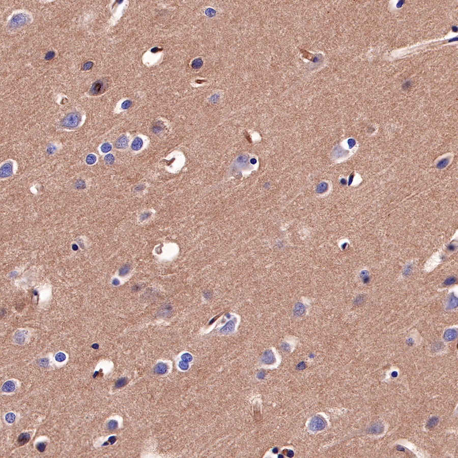 IHC shows positive staining in paraffin-embedded human cerebral cortex. Anti-CD155/PVR antibody was used at 1/1000 dilution, followed by a HRP Polymer for Mouse & Rabbit IgG (ready to use). Counterstained with hematoxylin. Heat mediated antigen retrieval with Tris/EDTA buffer pH9.0 was performed before commencing with IHC staining protocol.