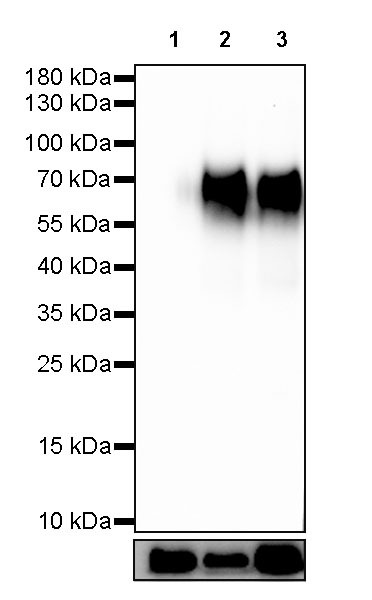 WB result of CD155 Rabbit mAb Primary antibody: CD155 Rabbit mAb at 1/1000 dilution Lane 1: Raji whole cell lysate 20 µg Lane 2: HUVEC whole cell lysate 20 µg Lane 3: HeLa whole cell lysate 20 µg Negative control: Raji whole cell lysate Secondary antibody: Goat Anti-Rabbit IgG, (H+L), HRP conjugated at 1/10000 dilution Predicted MW: 45kDa Observed MW: 70kDa