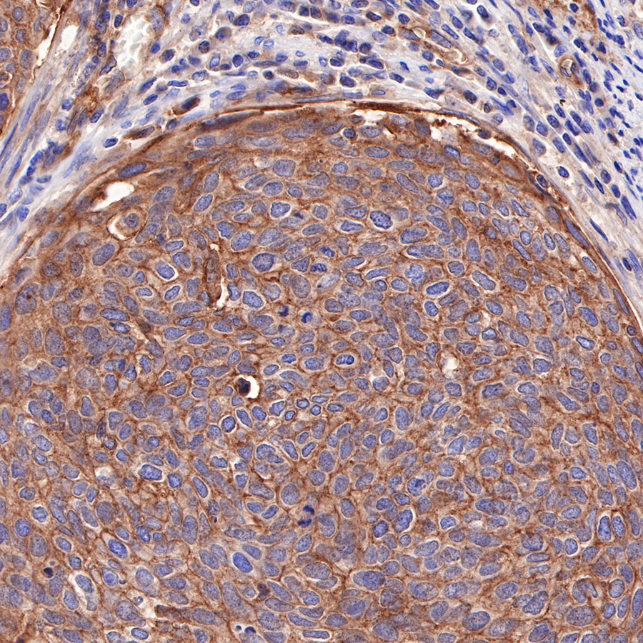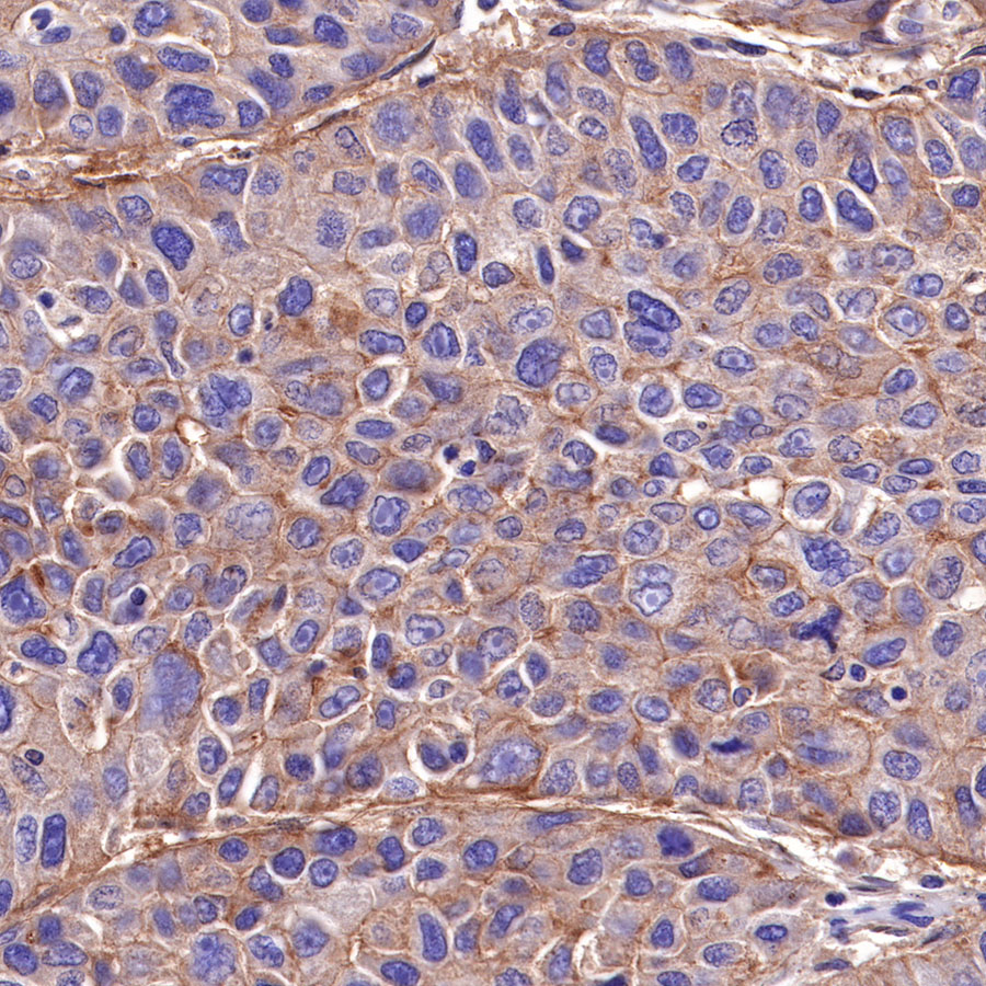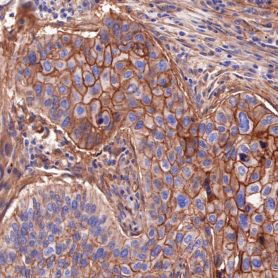 IHC shows positive staining in paraffin-embedded human cervical squamous cell carcinoma. Anti-CD155/PVR antibody was used at 1/1000 dilution, followed by a HRP Polymer for Mouse & Rabbit IgG (ready to use). Counterstained with hematoxylin. Heat mediated antigen retrieval with Tris/EDTA buffer pH9.0 was performed before commencing with IHC staining protocol.