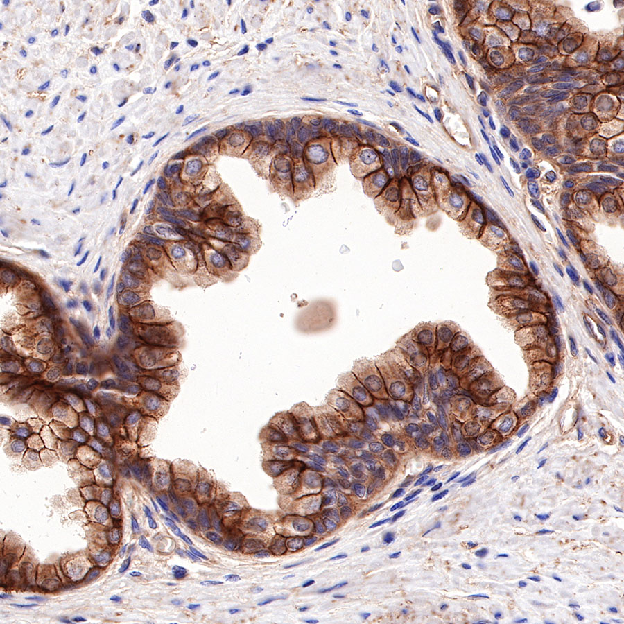 IHC shows positive staining in paraffin-embedded human prostate. Anti-CD155/PVR antibody was used at 1/1000 dilution, followed by a HRP Polymer for Mouse & Rabbit IgG (ready to use). Counterstained with hematoxylin. Heat mediated antigen retrieval with Tris/EDTA buffer pH9.0 was performed before commencing with IHC staining protocol.