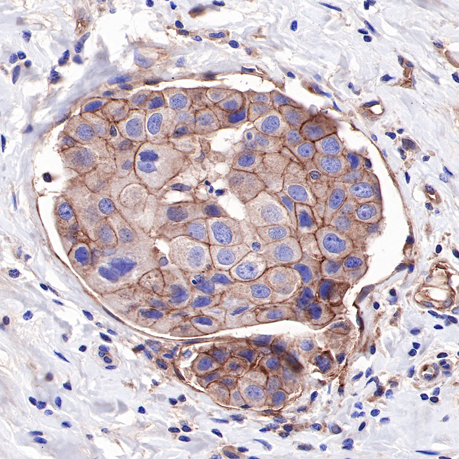 IHC shows positive staining in paraffin-embedded human breast cancer. Anti-CD155/PVR antibody was used at 1/1000 dilution, followed by a HRP Polymer for Mouse & Rabbit IgG (ready to use). Counterstained with hematoxylin. Heat mediated antigen retrieval with Tris/EDTA buffer pH9.0 was performed before commencing with IHC staining protocol.