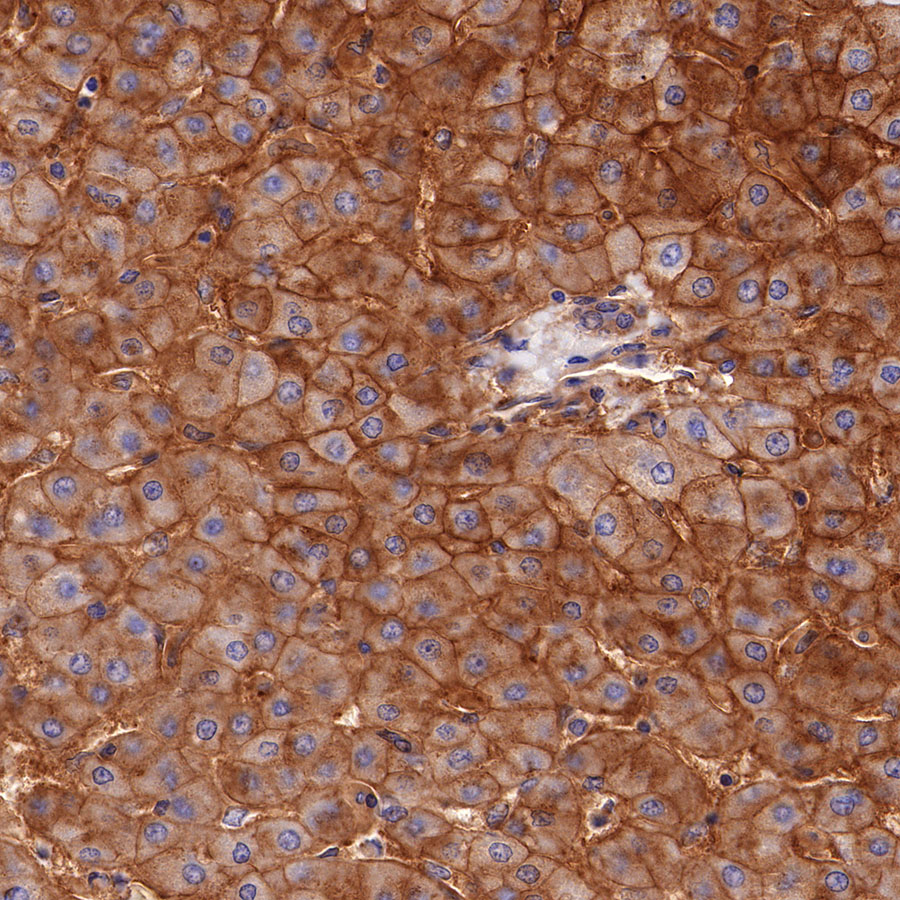 IHC shows positive staining in paraffin-embedded human hepatocellular carcinoma. Anti-CD155/PVR antibody was used at 1/2000 dilution, followed by a HRP Polymer for Mouse & Rabbit IgG (ready to use). Counterstained with hematoxylin. Heat mediated antigen retrieval with Tris/EDTA buffer pH9.0 was performed before commencing with IHC staining protocol.