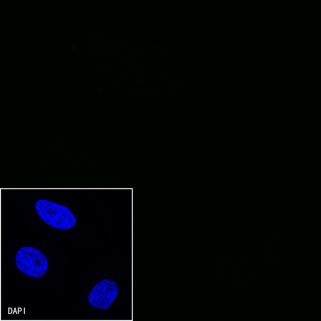 Negative control: ICC shows negative staining in HeLa cells.Anti-CD27 antibody was used at 1/500 dilution and incubated overnight at 4°C. Goat polyclonal Antibody to mouse IgG - H&L (Alexa Fluor® 488) was used as secondary antibody at 1/1000 dilution. The cells were fixed with 4% PFA and permeabilized with 0.1% PBS-Triton X-100. Nuclei were counterstained with DAPI (Blue).