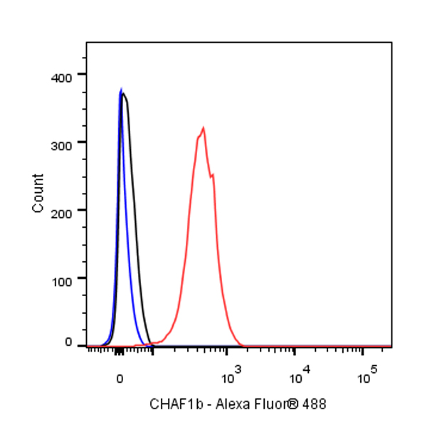 Flow cytometric analysis of 4% PFA fixed 90% methanol permeabilized HeLa (Human cervix adenocarcinoma epithelial cell) cells labelling CHAF1b antibody at 1/500 dilution (0.1 μg)/ (Red) compared with a Rabbit monoclonal IgG (Black) isotype control and an unlabelled control (cells without incubation with primary antibody and secondary antibody) (Blue). Goat Anti - Rabbit IgG Alexa Fluor® 488 was used as the secondary antibody.