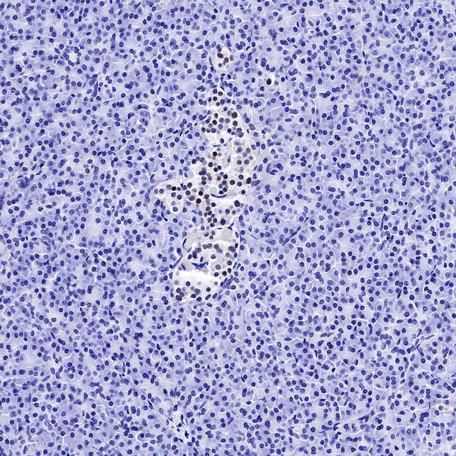 IHC shows positive staining in paraffin-embedded human pancreas. Anti-Cyclin D3 antibody was used at 1/500 dilution, followed by a HRP Polymer for Mouse & Rabbit IgG (ready to use). Counterstained with hematoxylin. Heat mediated antigen retrieval with Tris/EDTA buffer pH9.0 was performed before commencing with IHC staining protocol.