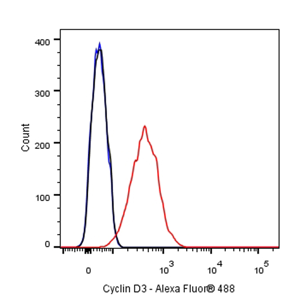 Flow cytometric analysis of 4% PFA fixed 90% methanol permeabilized HeLa (Human cervix adenocarcinoma epithelial cell) cells labelling Cyclin D3 antibody at 1/500 dilution (0.1 μg)/ (Red) compared with a Rabbit monoclonal IgG (Black) isotype control and an unlabelled control (cells without incubation with primary antibody and secondary antibody) (Blue). Goat Anti - Rabbit IgG Alexa Fluor® 488 was used as the secondary antibody.