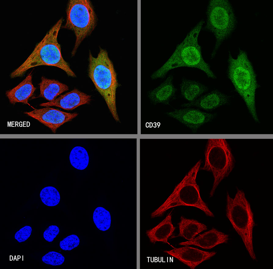 ICC shows positive staining in HeLa cells. Anti-Cyclin D3 antibody was used at 1/500 dilution (Green) and incubated overnight at 4°C. Goat polyclonal Antibody to Rabbit IgG - H&L (Alexa Fluor® 488) was used as secondary antibody at 1/1000 dilution. The cells were fixed with 4%PFA and permeabilized with 0.1% PBS-Triton X-100. Nuclei were counterstained with DAPI (Blue).Counterstain with tubulin (red).