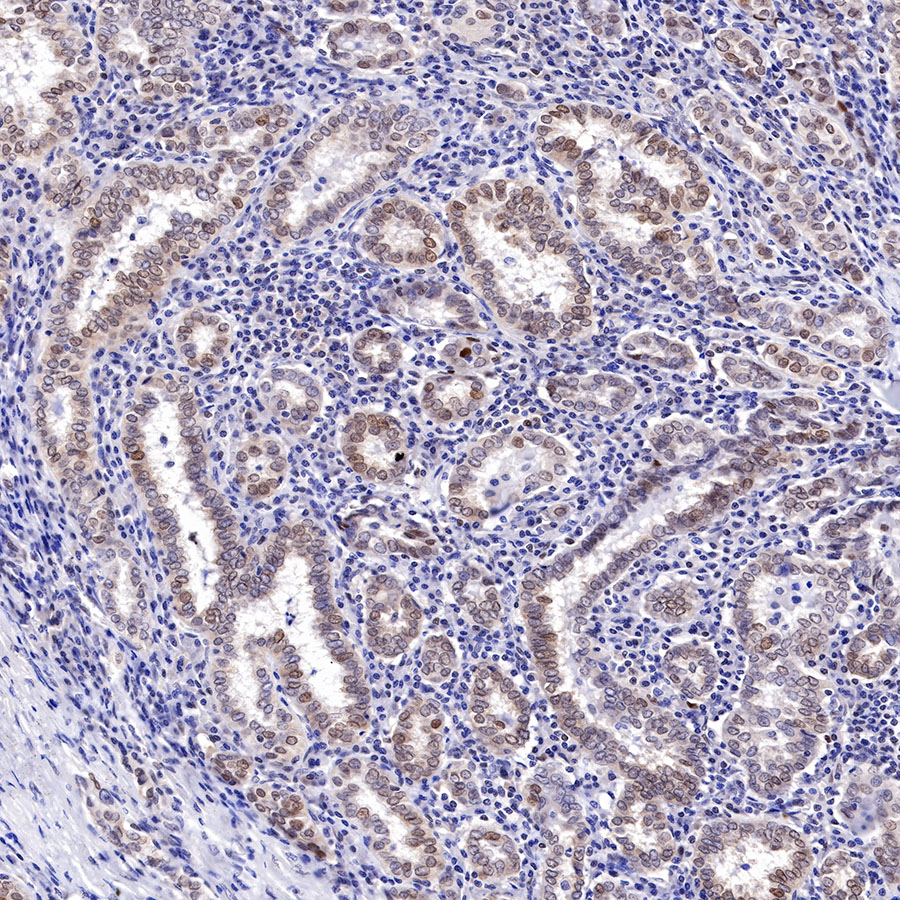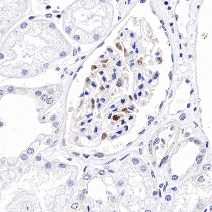 IHC shows positive staining in paraffin-embedded human kidney. Anti-Cyclin D3 antibody was used at 1/250 dilution, followed by a HRP Polymer for Mouse & Rabbit IgG (ready to use). Counterstained with hematoxylin. Heat mediated antigen retrieval with Tris/EDTA buffer pH9.0 was performed before commencing with IHC staining protocol.