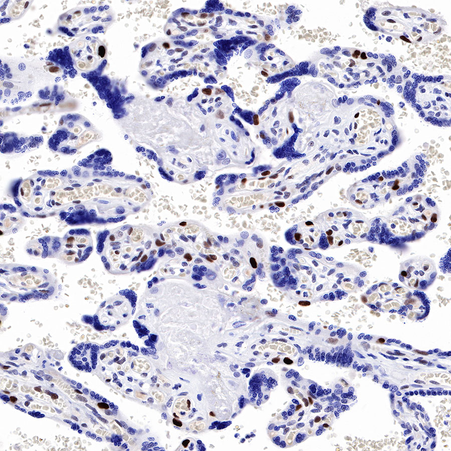 IHC shows positive staining in paraffin-embedded human placenta. Anti-Cyclin D3 antibody was used at 1/500 dilution, followed by a HRP Polymer for Mouse & Rabbit IgG (ready to use). Counterstained with hematoxylin. Heat mediated antigen retrieval with Tris/EDTA buffer pH9.0 was performed before commencing with IHC staining protocol.