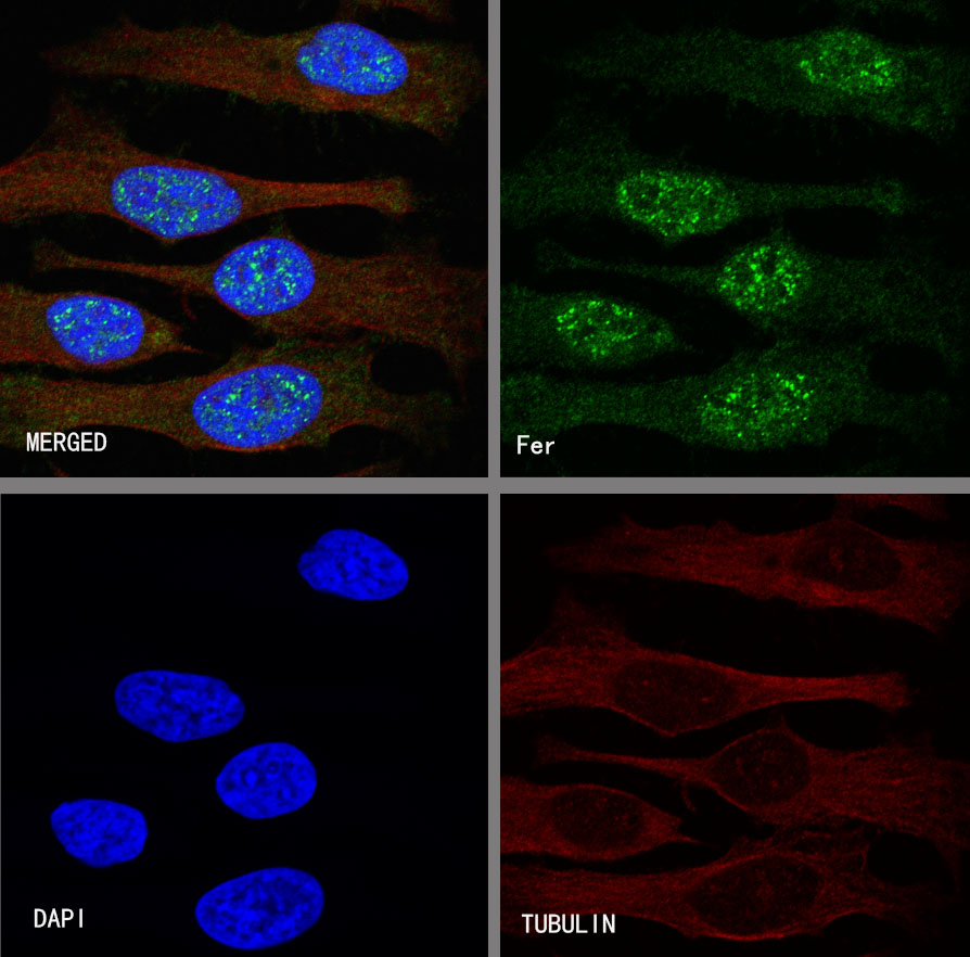 ICC shows positive staining in HeLa cells. Anti-Fer antibody was used at 1/500 dilution (Green) and incubated overnight at 4°C. Goat polyclonal Antibody to Rabbit IgG - H&L (Alexa Fluor® 488) was used as secondary antibody at 1/1000 dilution. The cells were fixed with 100% ice-cold methanol and permeabilized with 0.1% PBS-Triton X-100. Nuclei were counterstained with DAPI (Blue).Counterstain with tubulin (red).