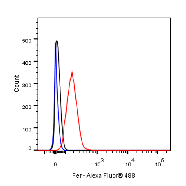 Flow cytometric analysis of 4% PFA fixed 90% methanol permeabilized HeLa (Human cervix adenocarcinoma epithelial cell) cells labelling Fer antibody at 1/50 dilution (1 μg)/ (Red) compared with a Rabbit monoclonal IgG (Black) isotype control and an unlabelled control (cells without incubation with primary antibody and secondary antibody) (Blue). Goat Anti - Rabbit IgG Alexa Fluor® 488 was used as the secondary antibody.