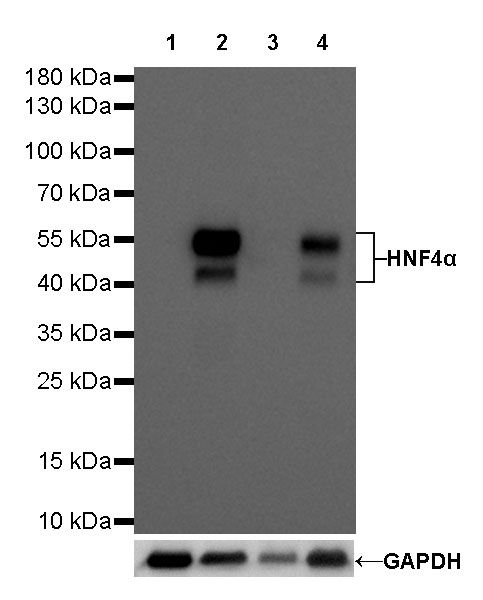 WB result of HNF4α Rabbit mAb Primary antibody: HNF4α Rabbit mAb at 1/1000 dilution Lane 1: HeLa whole cell lysate 20 µg Lane 2: HepG2 whole cell lysate 20 µg Lane 3: SW480 whole cell lysate 20 µg Lane 4: Caco-2 whole cell lysate 20 µg Negative control: HeLa whole cell lysate Secondary antibody: Goat Anti-Rabbit IgG, (H+L), HRP conjugated at 1/10000 dilution Predicted MW: 53kDa Observed MW: 45~55 kDa