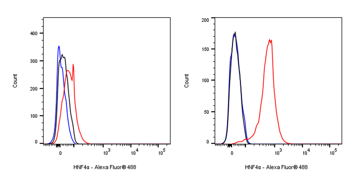 Flow cytometric analysis of 4% PFA fixed 90% methanol permeabilized HeLa (Left) / HepG2 (Right) cells labelling HNF4α antibody at 1/500 dilution (0.1 μg)/ (Red) compared with a Rabbit monoclonal IgG (Black) isotype control and an unlabelled control (cells without incubation with primary antibody and secondary antibody) (Blue). Goat Anti-Rabbit IgG Alexa Fluor® 488 was used as the secondary antibody. Negative control: HeLa