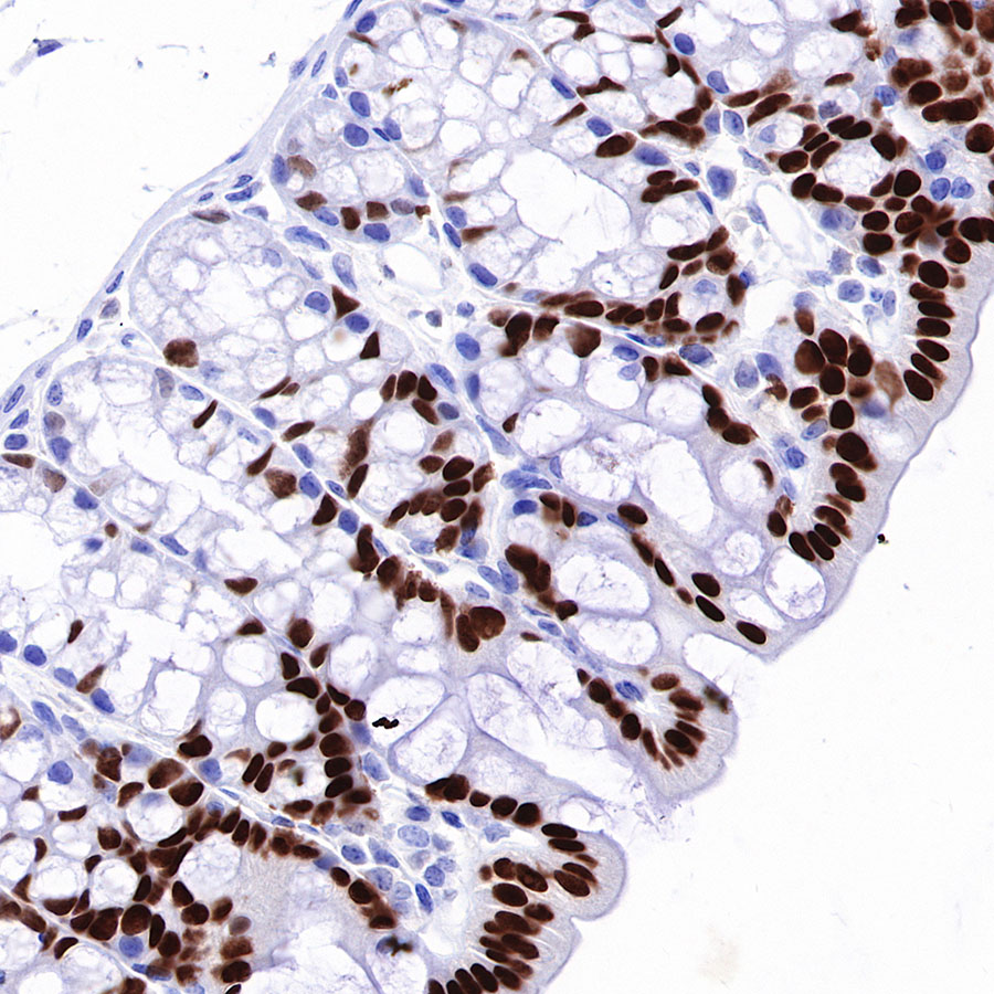 IHC shows positive staining in paraffin-embedded mouse colon. Anti-HNF4α antibody was used at 1/500 dilution, followed by a HRP Polymer for Mouse & Rabbit IgG (ready to use). Counterstained with hematoxylin. Heat mediated antigen retrieval with Tris/EDTA buffer pH9.0 was performed before commencing with IHC staining protocol.