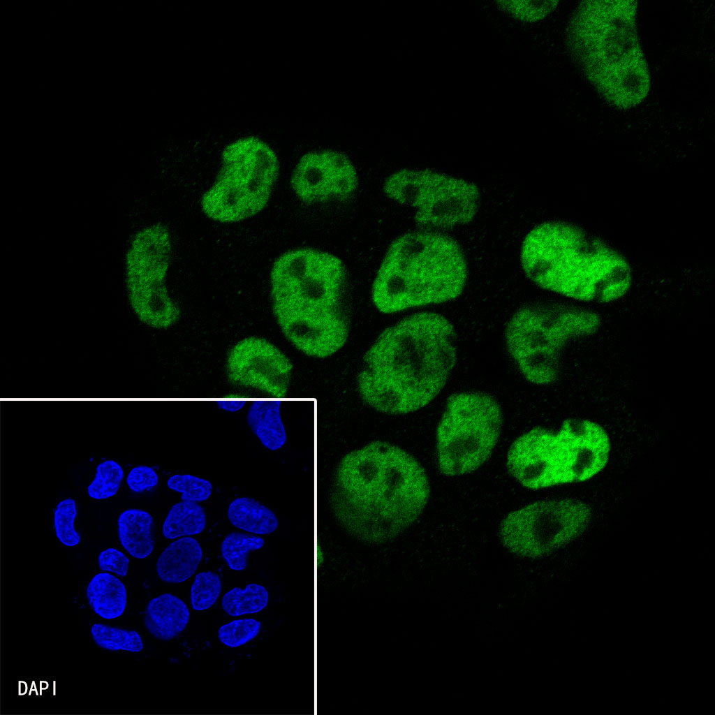 ICC shows positive staining in HepG2 cells. Anti-HNF4α antibody was used at 1/500 dilution (Green) and incubated overnight at 4°C. Goat polyclonal Antibody to Rabbit IgG - H&L (Alexa Fluor® 488) was used as secondary antibody at 1/1000 dilution. The cells were fixed with 4% PFA and permeabilized with 0.1% PBS-Triton X-100. Nuclei were counterstained with DAPI (Blue).