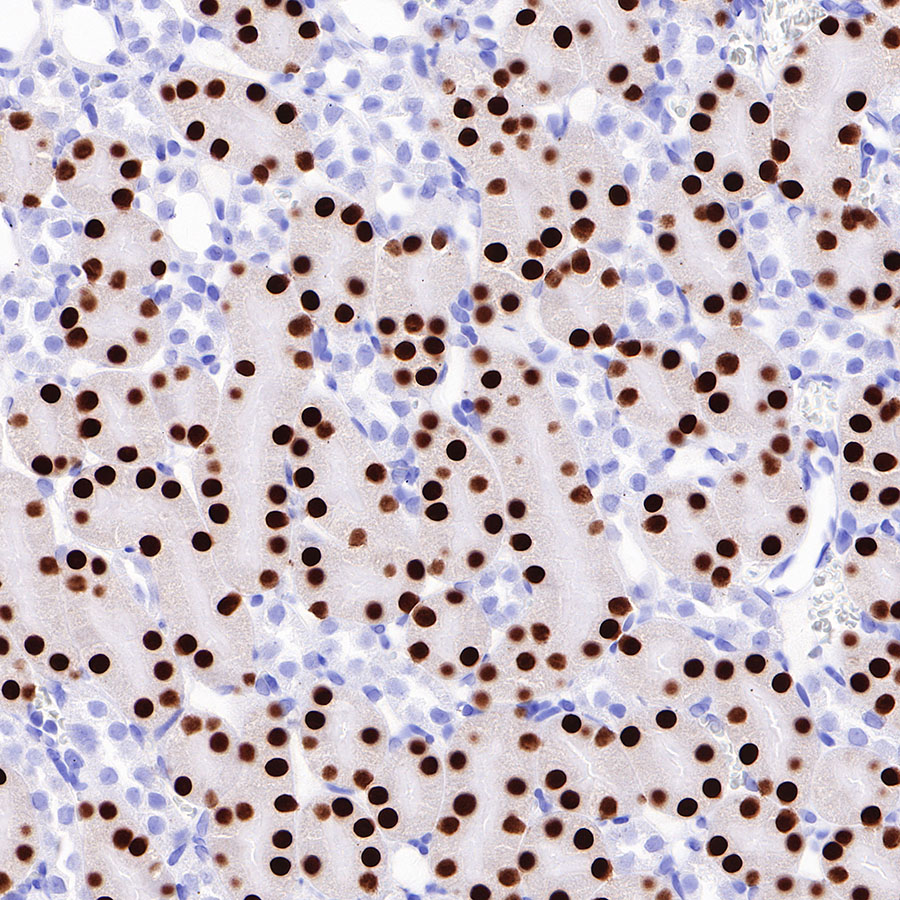 IHC shows positive staining in paraffin-embedded human kidney. Anti-HNF4α antibody was used at 1/500 dilution, followed by a HRP Polymer for Mouse & Rabbit IgG (ready to use). Counterstained with hematoxylin. Heat mediated antigen retrieval with Tris/EDTA buffer pH9.0 was performed before commencing with IHC staining protocol.