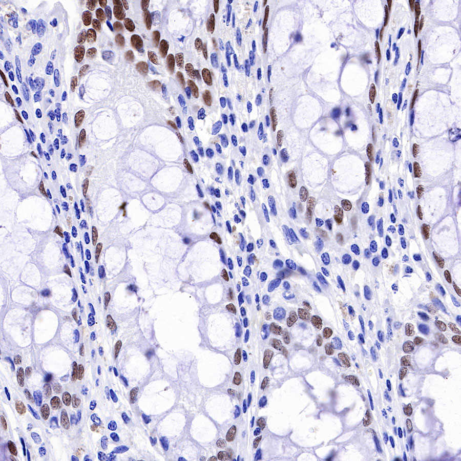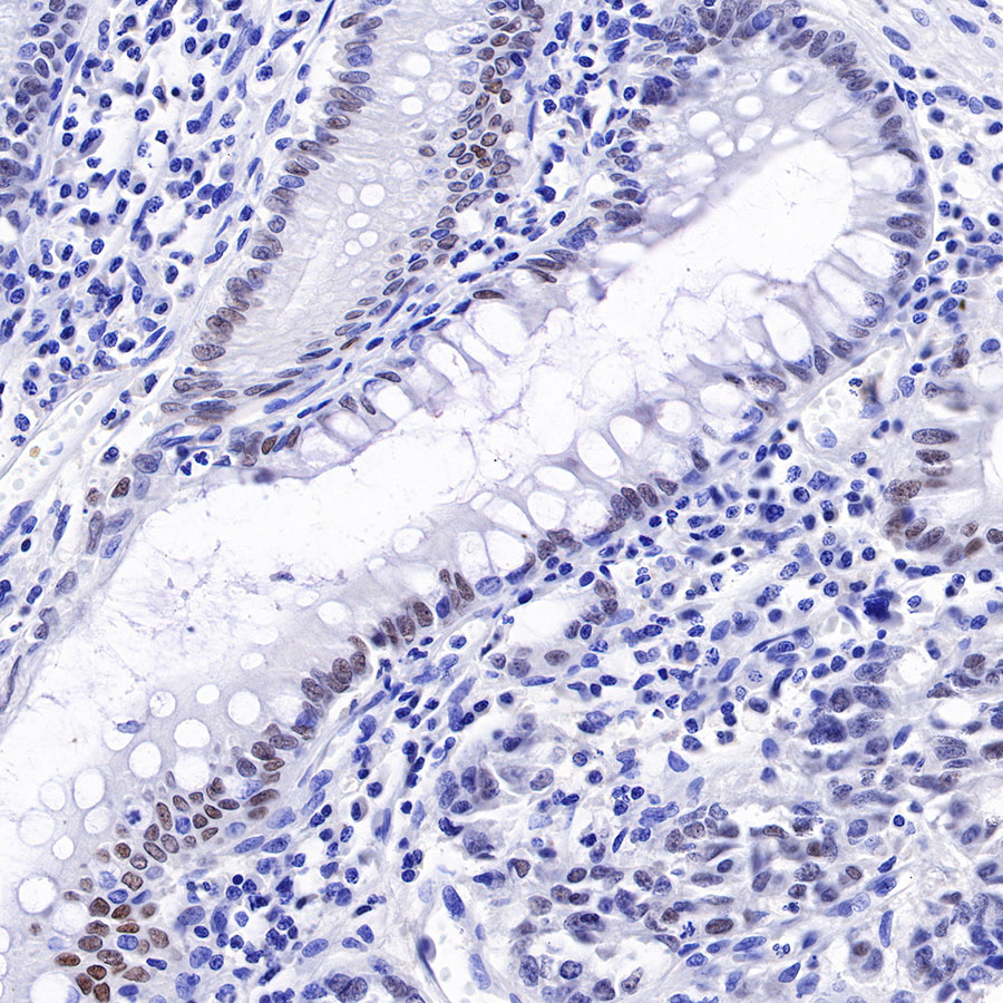 IHC shows positive staining in paraffin-embedded human colon. Anti-HNF4α antibody was used at 1/500 dilution, followed by a HRP Polymer for Mouse & Rabbit IgG (ready to use). Counterstained with hematoxylin. Heat mediated antigen retrieval with Tris/EDTA buffer pH9.0 was performed before commencing with IHC staining protocol.