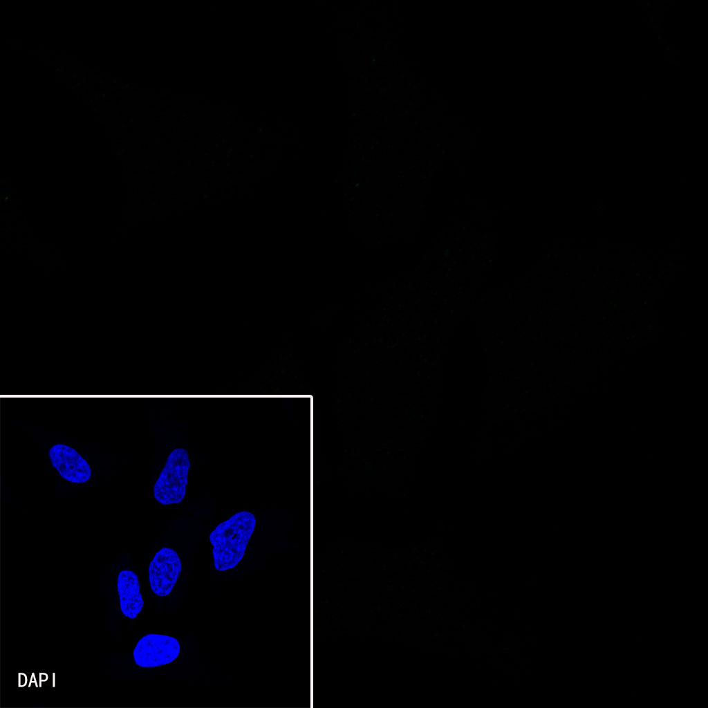 Negative control: ICC shows negative staining in HeLa cells. Anti-HNF4α antibody was used at 1/500 dilution and incubated overnight at 4°C. Goat polyclonal Antibody to Rabbit IgG - H&L (Alexa Fluor® 488) was used as secondary antibody at 1/1000 dilution. The cells were fixed with 4% PFA and permeabilized with 0.1% PBS-Triton X-100. Nuclei were counterstained with DAPI (Blue).