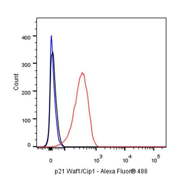 Flow cytometric analysis of 4% PFA fixed 90% methanol permeabilized HeLa (Human cervix adenocarcinoma epithelial cell) cells labeling p21 Waf1/Cip1 at 1/50 dilution (1 μg) / (red) compared with a mouse monoclonal IgG isotype control (black) and an unlabeled control (cells without incubation with primary antibody and secondary antibody) (Blue). Goat Anti - Mouse IgG Alexa Fluor® 488 was used as the secondary antibody.