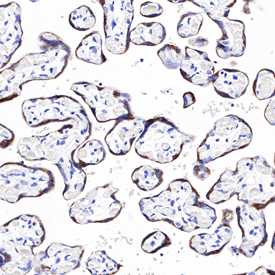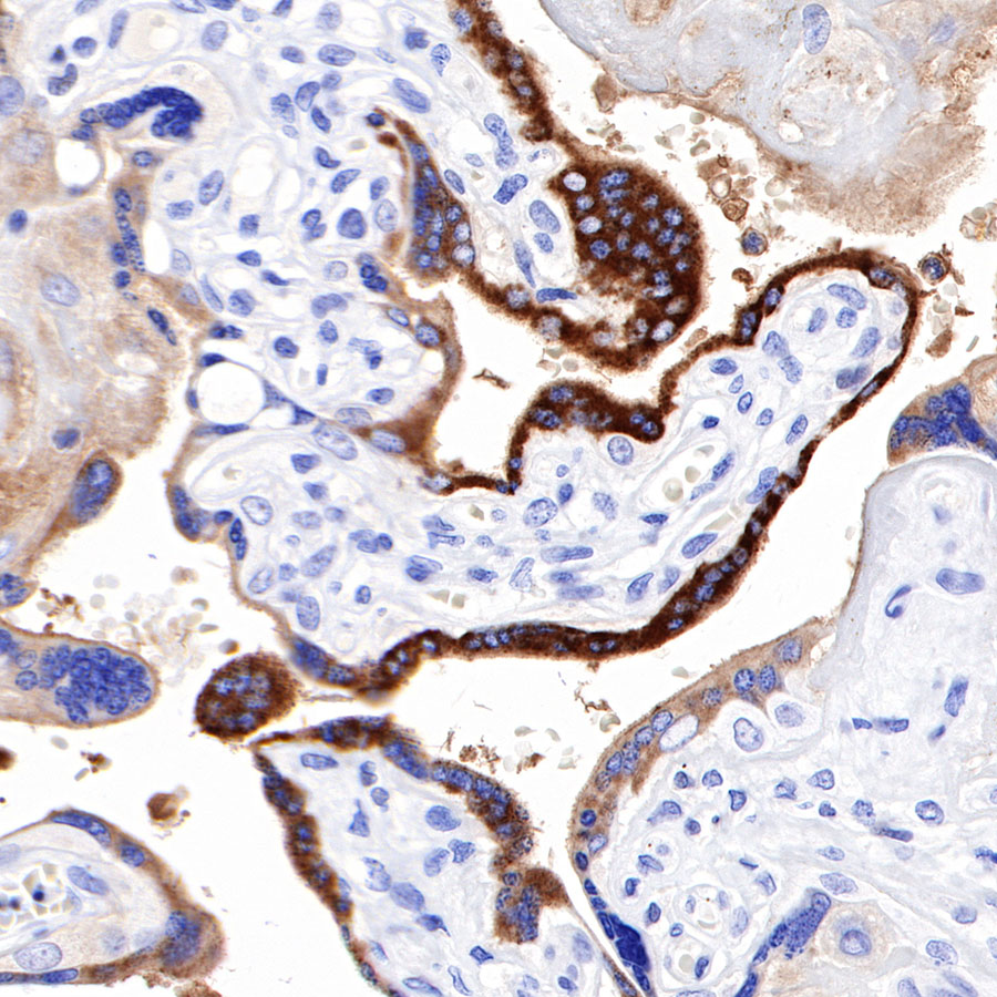 IHC shows positive staining in paraffin-embedded human placenta. Anti-PAPP-A antibody was used at 1/1000 dilution, followed by a HRP Polymer for Mouse & Rabbit IgG (ready to use). Counterstained with hematoxylin. Heat mediated antigen retrieval with Tris/EDTA buffer pH9.0 was performed before commencing with IHC staining protocol.