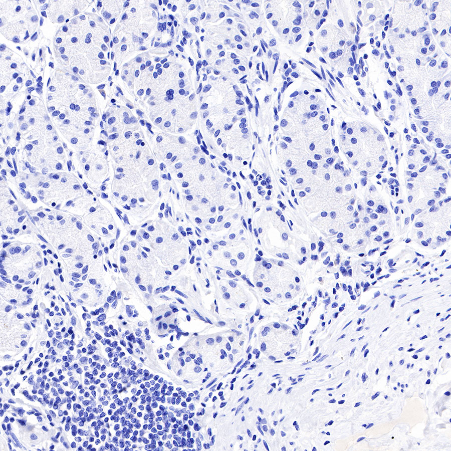 Negative control: IHC shows negative staining in paraffin-embedded human stomach. Anti-PAPP-A antibody was used at 1/1000 dilution, followed by a HRP Polymer for Mouse & Rabbit IgG (ready to use). Counterstained with hematoxylin. Heat mediated antigen retrieval with Tris/EDTA buffer pH9.0 was performed before commencing with IHC staining protocol.