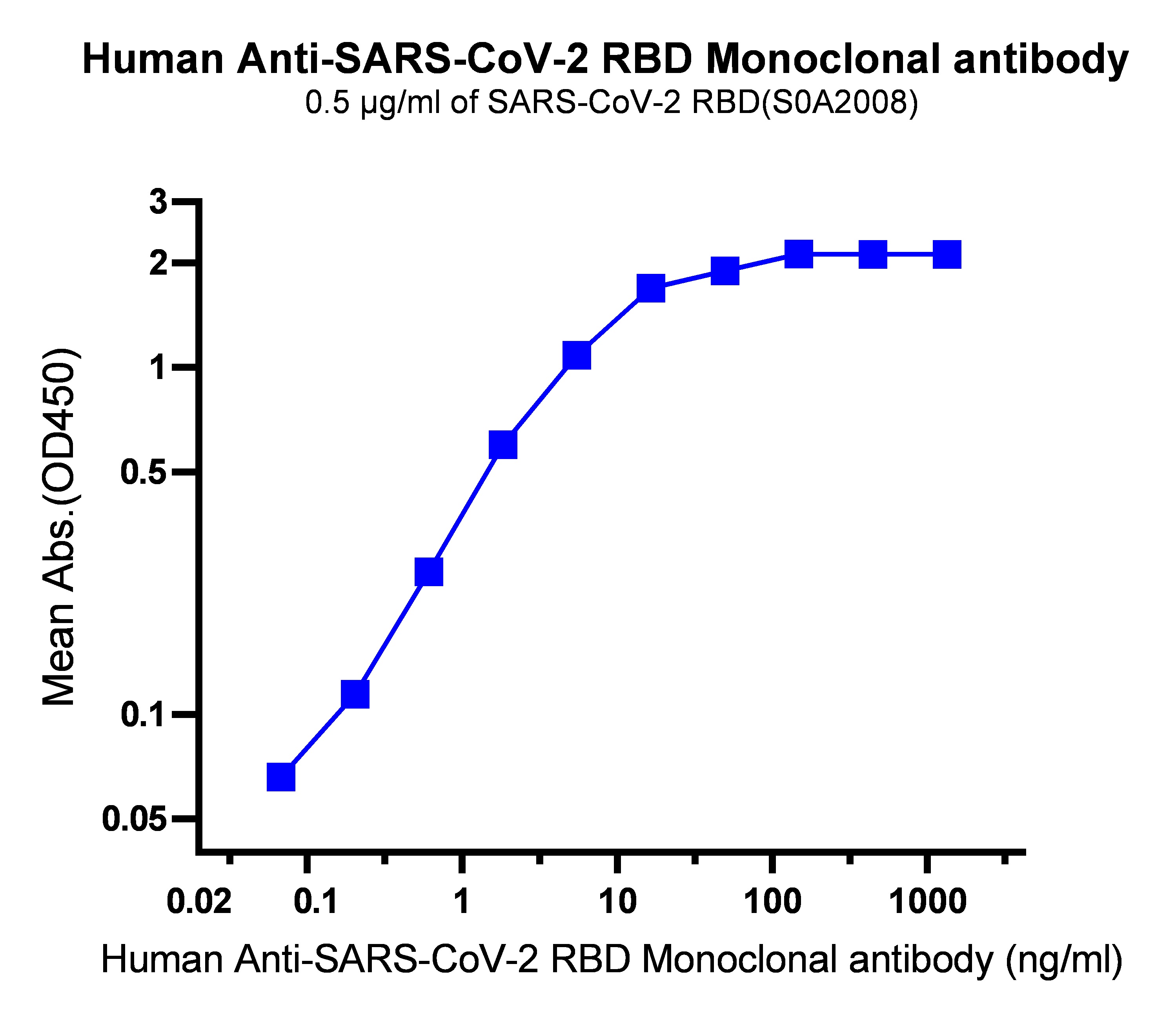 Anti-SARS-CoV-2 RBD Antibody (dilutions start from 4ug/ml) can bind to Immobilized SARS-CoV-2 RBD, His tag(S0A2008) at 0.5μg/ml (50μL/well) as coating antigen.