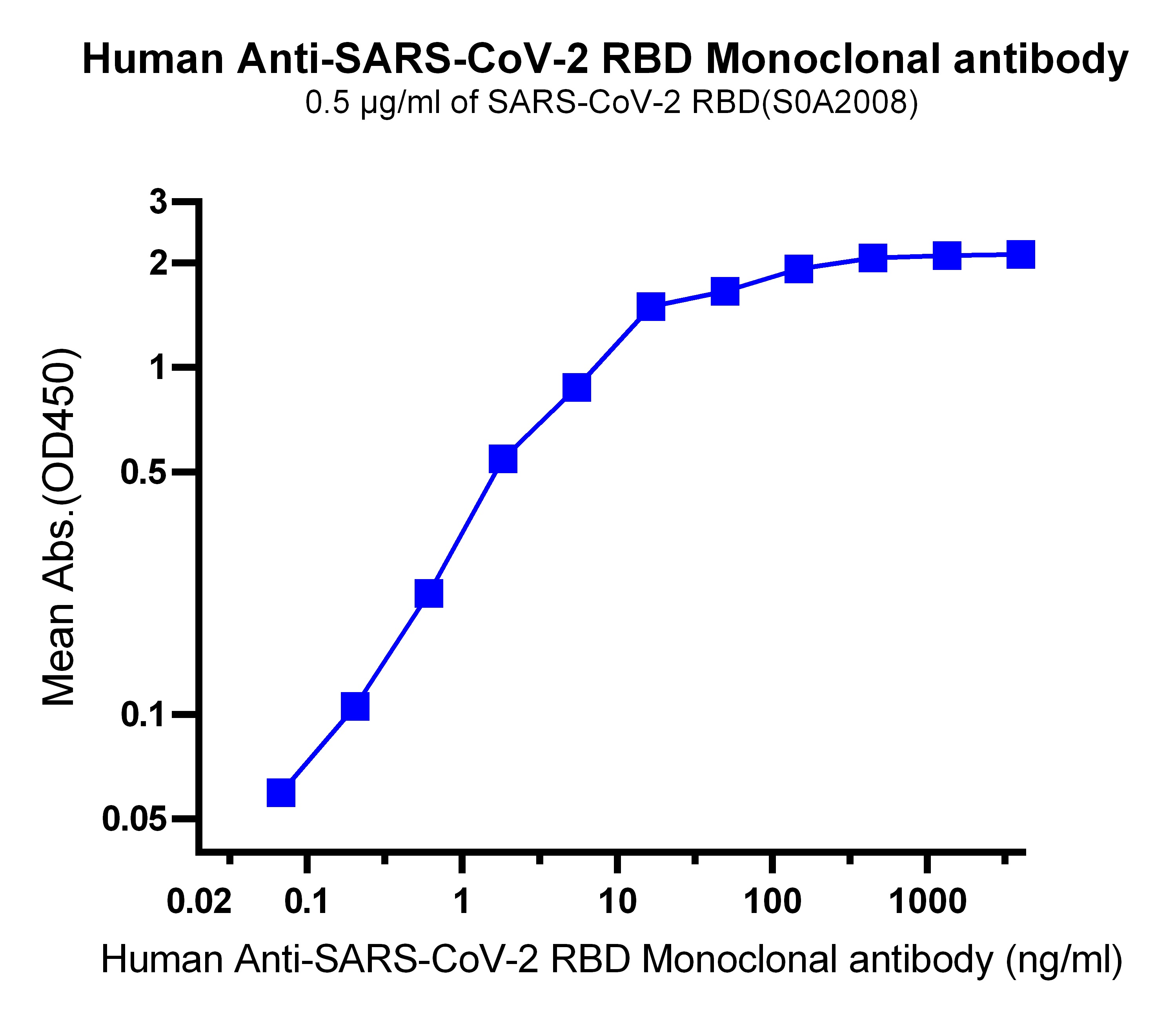 Anti-SARS-CoV-2 RBD Antibody (dilutions start from 4ug/ml) can bind to Immobilized SARS-CoV-2 RBD, His tag(S0A2008) at 0.5μg/ml (50μL/well) as coating antigen.