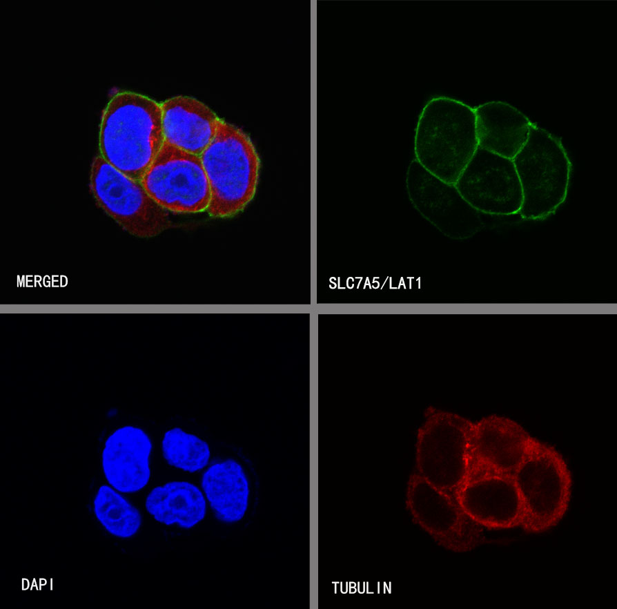 ICC shows positive staining in MCF7 cells. Anti-SLC7A5/LAT1 antibody was used at 1/500 dilution (Green) and incubated overnight at 4°C. Goat polyclonal Antibody to Rabbit IgG - H&L (Alexa Fluor® 488) was used as secondary antibody at 1/1000 dilution. The cells were fixed with 4%PFA and permeabilized with 0.1% PBS-Triton X-100. Nuclei were counterstained with DAPI (Blue).Counterstain with tubulin (Red).