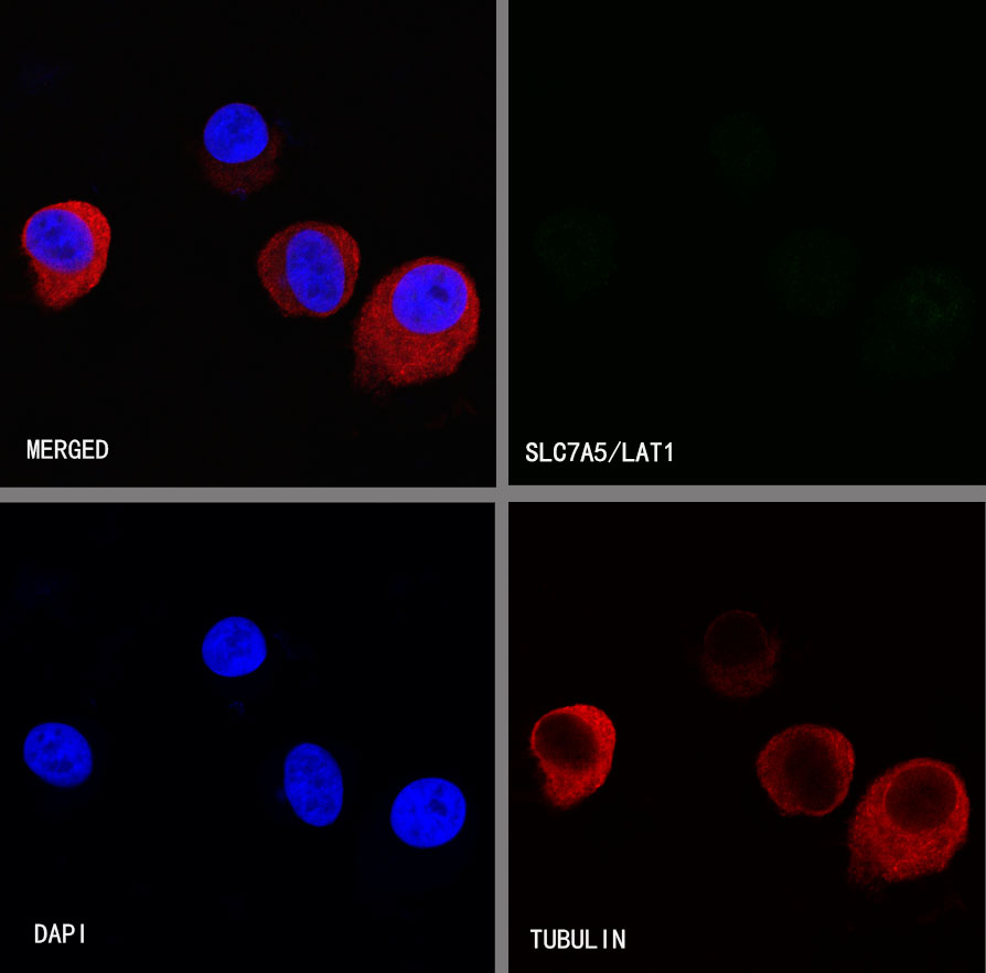Negative control:ICC shows negative staining in LNCAP cells. Anti-SLC7A5/LAT1 antibody was used at 1/500 dilution and incubated overnight at 4°C. Goat polyclonal Antibody to Rabbit IgG - H&L (Alexa Fluor® 488) was used as secondary antibody at 1/1000 dilution. The cells were fixed with 4%PFA and permeabilized with 0.1% PBS-Triton X-100. Nuclei were counterstained with DAPI (Blue).Counterstain with tubulin (red).