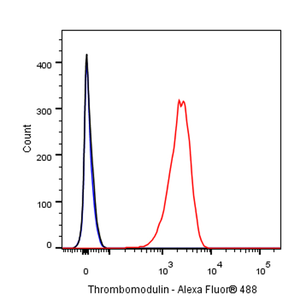 Flow cytometric analysis of A431 (Human epidermoid carcinoma epithelial cell) cells labelling Thrombomodulin antibody at 1/250 dilution (0.1 μg)/ (Red) compared with a Rabbit monoclonal IgG (Black) isotype control and an unlabelled control (cells without incubation with primary antibody and secondary antibody) (Blue). Goat Anti - Rabbit IgG Alexa Fluor® 488 was used as the secondary antibody.