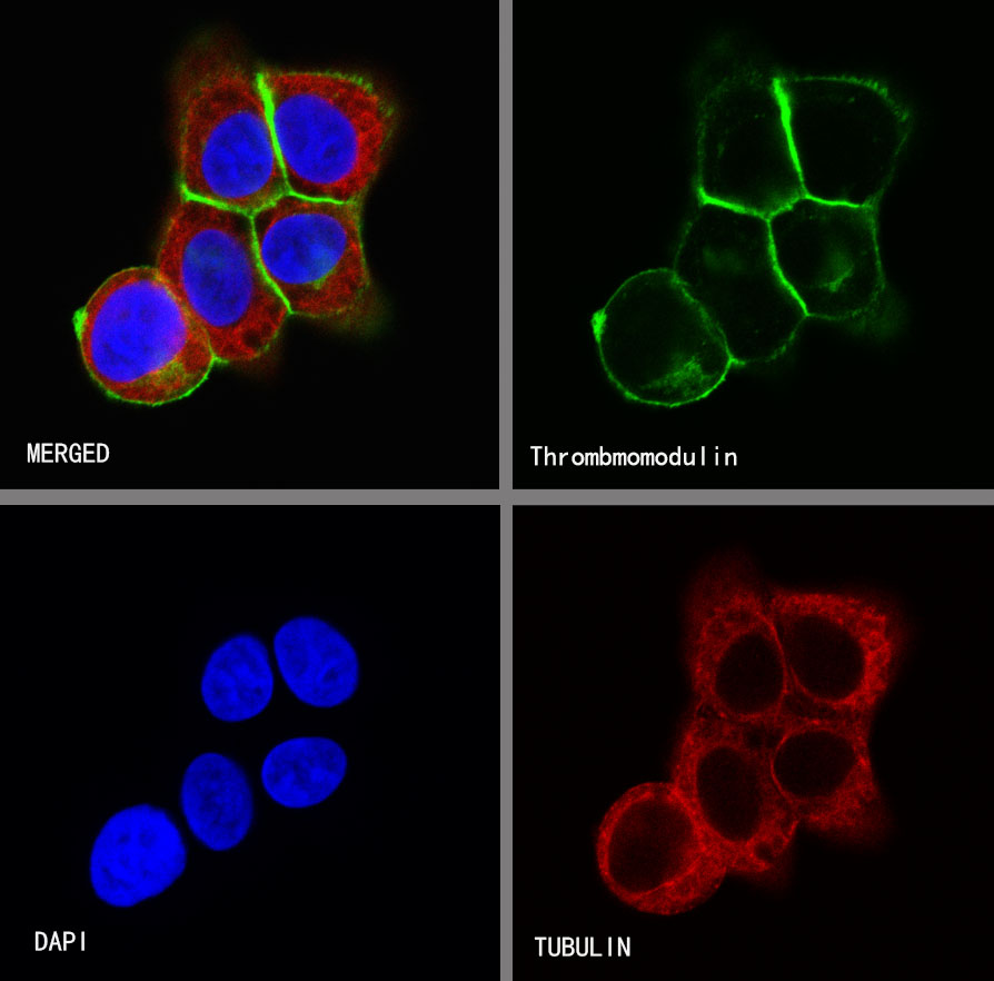 ICC shows positive staining in A431 cells. Anti-Thrombomodulin antibody was used at 1/250 dilution (Green) and incubated overnight at 4°C. Goat polyclonal Antibody to Rabbit IgG - H&L (Alexa Fluor® 488) was used as secondary antibody at 1/1000 dilution. The cells were fixed with 100% ice-cold methanoland permeabilized with 0.1% PBS-Triton X-100. Nuclei were counterstained with DAPI (Blue).Counterstain with tubulin (Red).