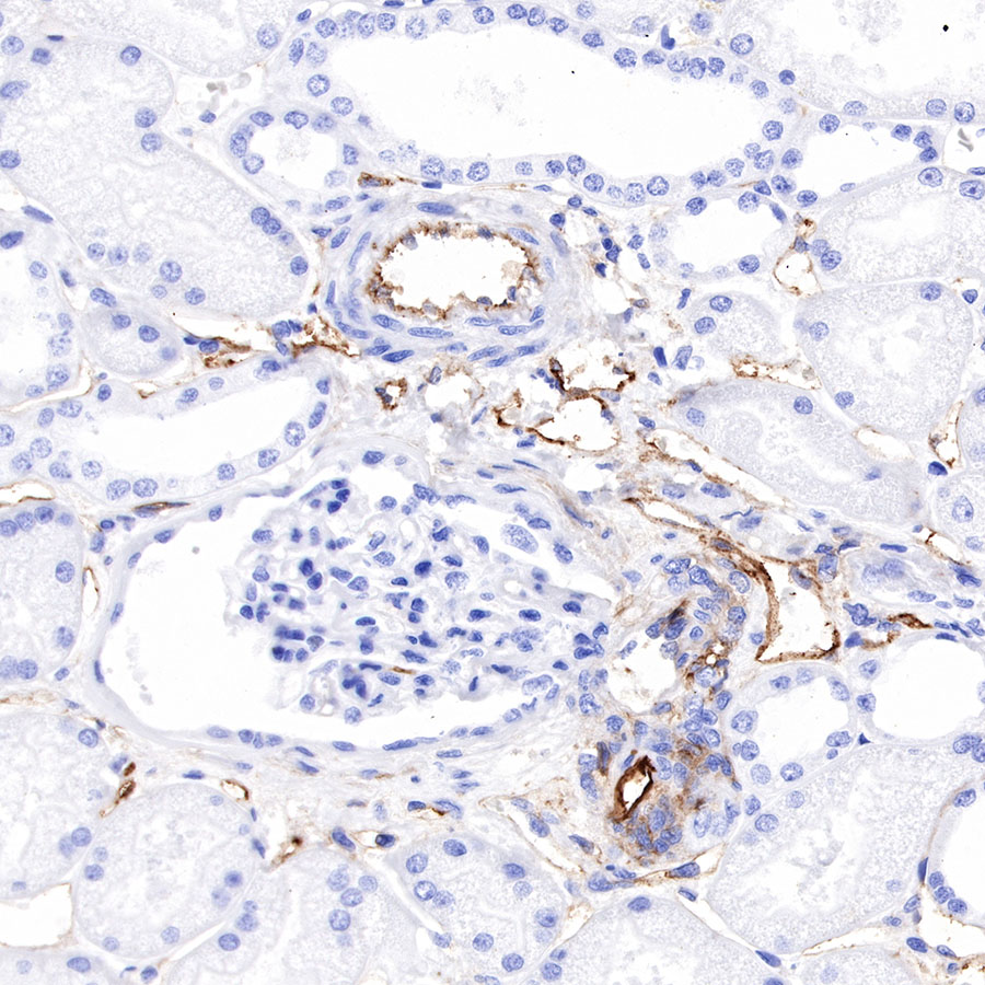 IHC shows positive staining in paraffin-embedded human kidney. Anti-Thrombomodulin antibody was used at 1/1000 dilution, followed by a HRP Polymer for Mouse & Rabbit IgG (ready to use). Counterstained with hematoxylin. Heat mediated antigen retrieval with Tris/EDTA buffer pH9.0 was performed before commencing with IHC staining protocol.