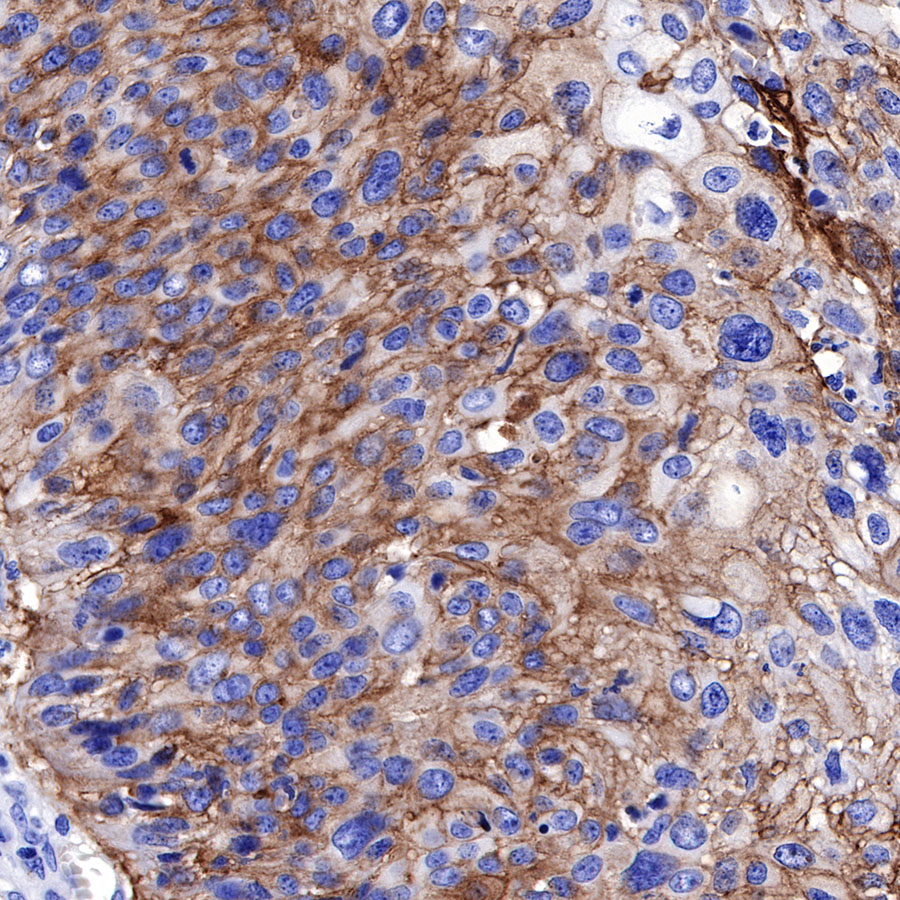 IHC shows positive staining in paraffin-embedded human cervcial squamous cell carcinoma. Anti-Thrombomodulin antibody was used at 1/1000 dilution, followed by a HRP Polymer for Mouse & Rabbit IgG (ready to use). Counterstained with hematoxylin. Heat mediated antigen retrieval with Tris/EDTA buffer pH9.0 was performed before commencing with IHC staining protocol.