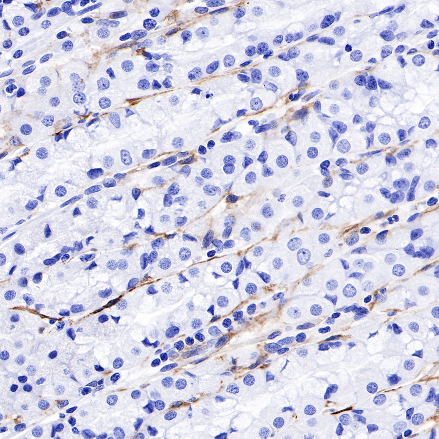 IHC shows positive staining in paraffin-embedded human stomach. Anti-Thrombomodulin antibody was used at 1/1000 dilution, followed by a HRP Polymer for Mouse & Rabbit IgG (ready to use). Counterstained with hematoxylin. Heat mediated antigen retrieval with Tris/EDTA buffer pH9.0 was performed before commencing with IHC staining protocol.