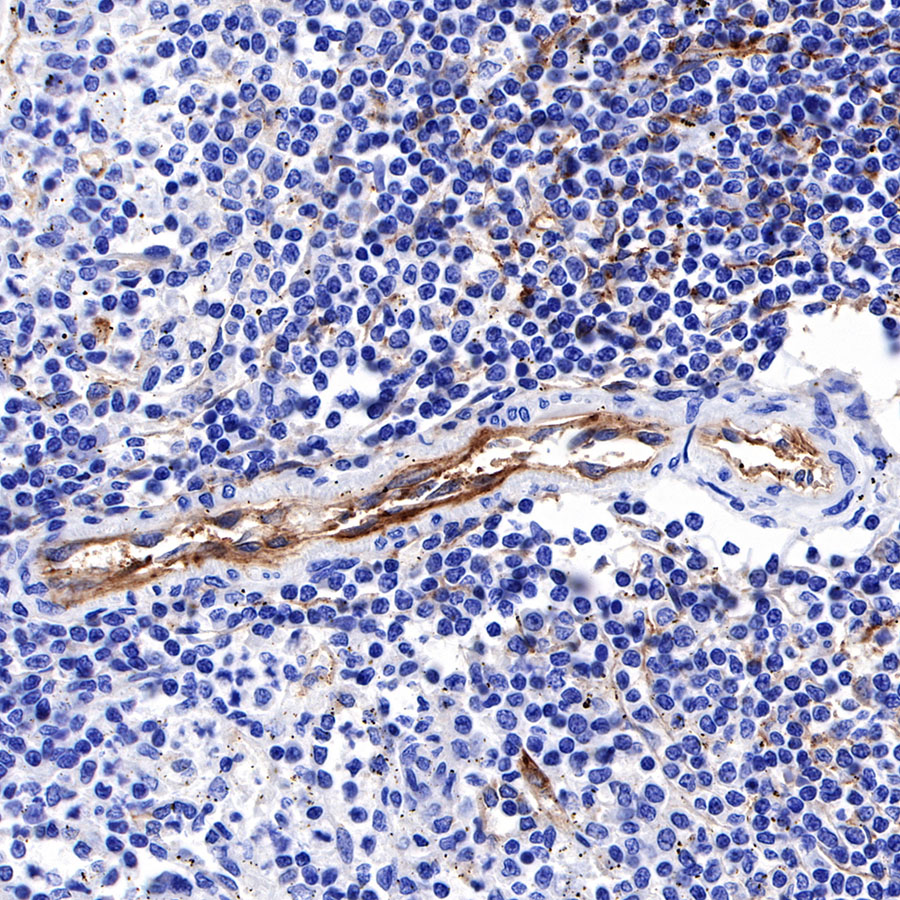 IHC shows positive staining in paraffin-embedded human spleen. Anti-Thrombomodulin antibody was used at 1/1000 dilution, followed by a HRP Polymer for Mouse & Rabbit IgG (ready to use). Counterstained with hematoxylin. Heat mediated antigen retrieval with Tris/EDTA buffer pH9.0 was performed before commencing with IHC staining protocol.