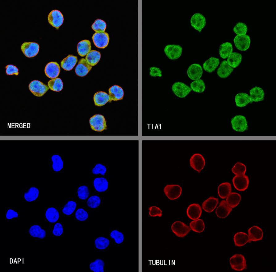 ICC shows positive staining in Jurkat cells. Anti-TIA1 antibody was used at 1/500 dilution (Green) and incubated overnight at 4°C. Goat polyclonal Antibody to Rabbit IgG - H&L (Alexa Fluor® 488) was used as secondary antibody at 1/1000 dilution. The cells were fixed with 4% PFA and permeabilized with 0.1% PBS-Triton X-100. Nuclei were counterstained with DAPI (Blue).Counterstain with tubulin (Red).
