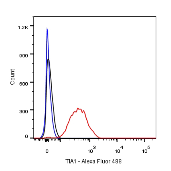 Flow cytometric analysis of Jurkat cells labelling TIA1 antibody at 1/500 dilution/ (red) compared with a Rabbit monoclonal IgG (Black) isotype control and an unlabelled control (cells without incubation with primary antibody and secondary antibody) (Blue). Goat Anti-Rabbit IgG Alexa Fluor® 488 at 1/1000 dilution was used as the secondary antibody.