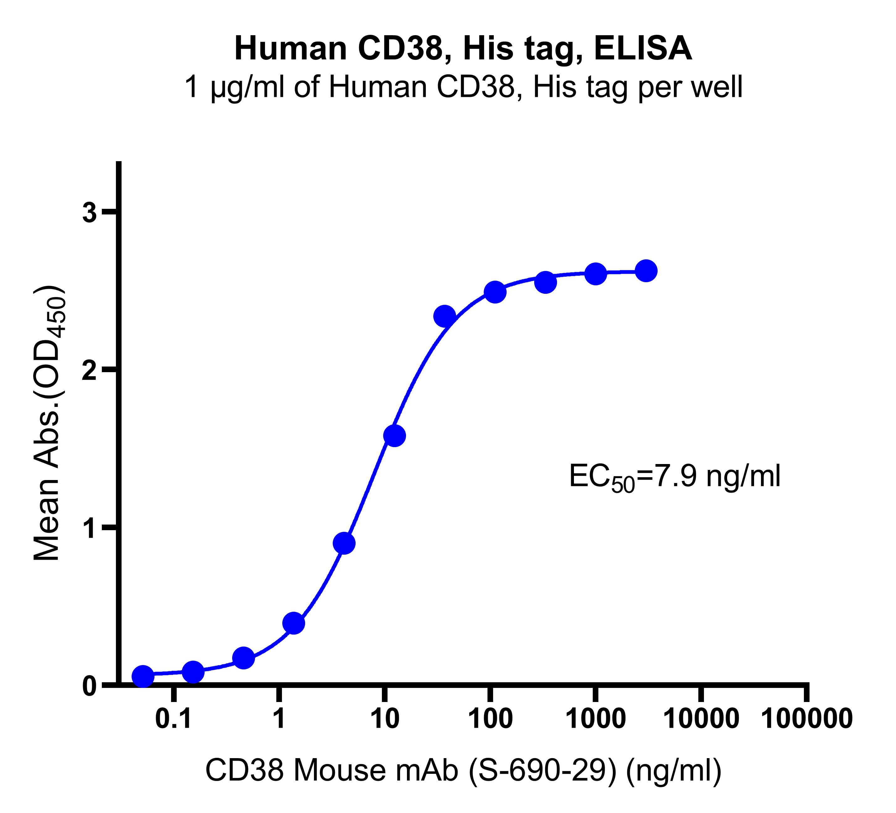 Immobilized Human CD38, His tag at 1 μg/mL (50 μL/well) can bind CD38 Mouse mAb (S-690-29) (S0B0395) with EC50 of 6.880-9.268 ng/ml.