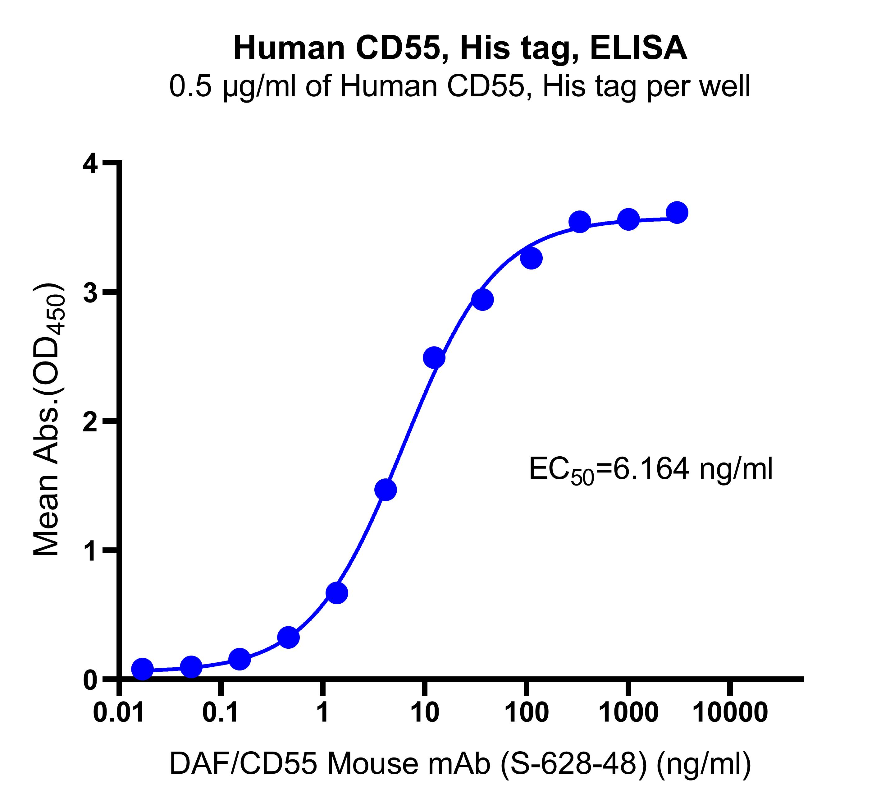 Immobilized Human CD55, His tag at 0.5 μg/mL (50 μL/well) can bind DAF/CD55 Mouse mAb (S-628-48) (S0B0369) with EC50 of 4.992-7.638 ng/ml.