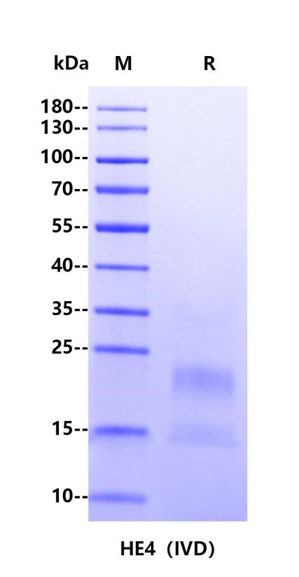 HE4 (human epididymis protein 4) is a new tumor marker for ovarian cancer, and the incidence of ovarian cancer ranks third among the three gynecological malignancies. Early diagnosis is crucial to the cure rate of ovarian cancer. Normally, HE4 is expressed at very low levels in humans, but it can be very high in the tissues and serum of ovarian cancer patients and has a high sensitivity for ovarian cancer detection, especially in the early asymptomatic stage.This product is the recombinant human HE4 protein expressed from human 293 cells (HEK293).