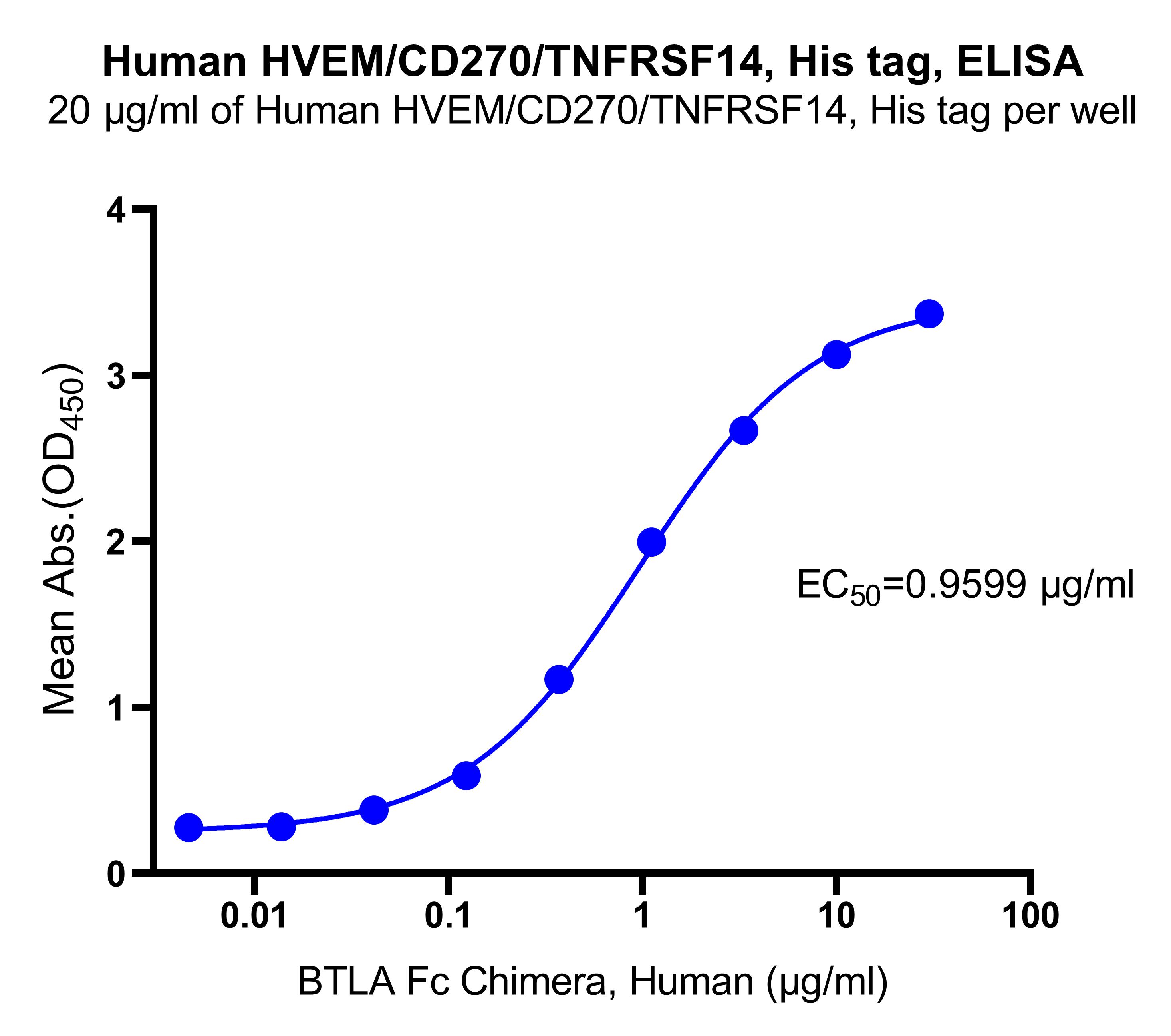 Immobilized Human HVEM/CD270/TNFRSF14, His tag at 20 μg/mL (50 μL/well) can bind BTLA Fc Chimera, Human (UA010754) with EC50 of 0.8393-1.108 μg/ml.